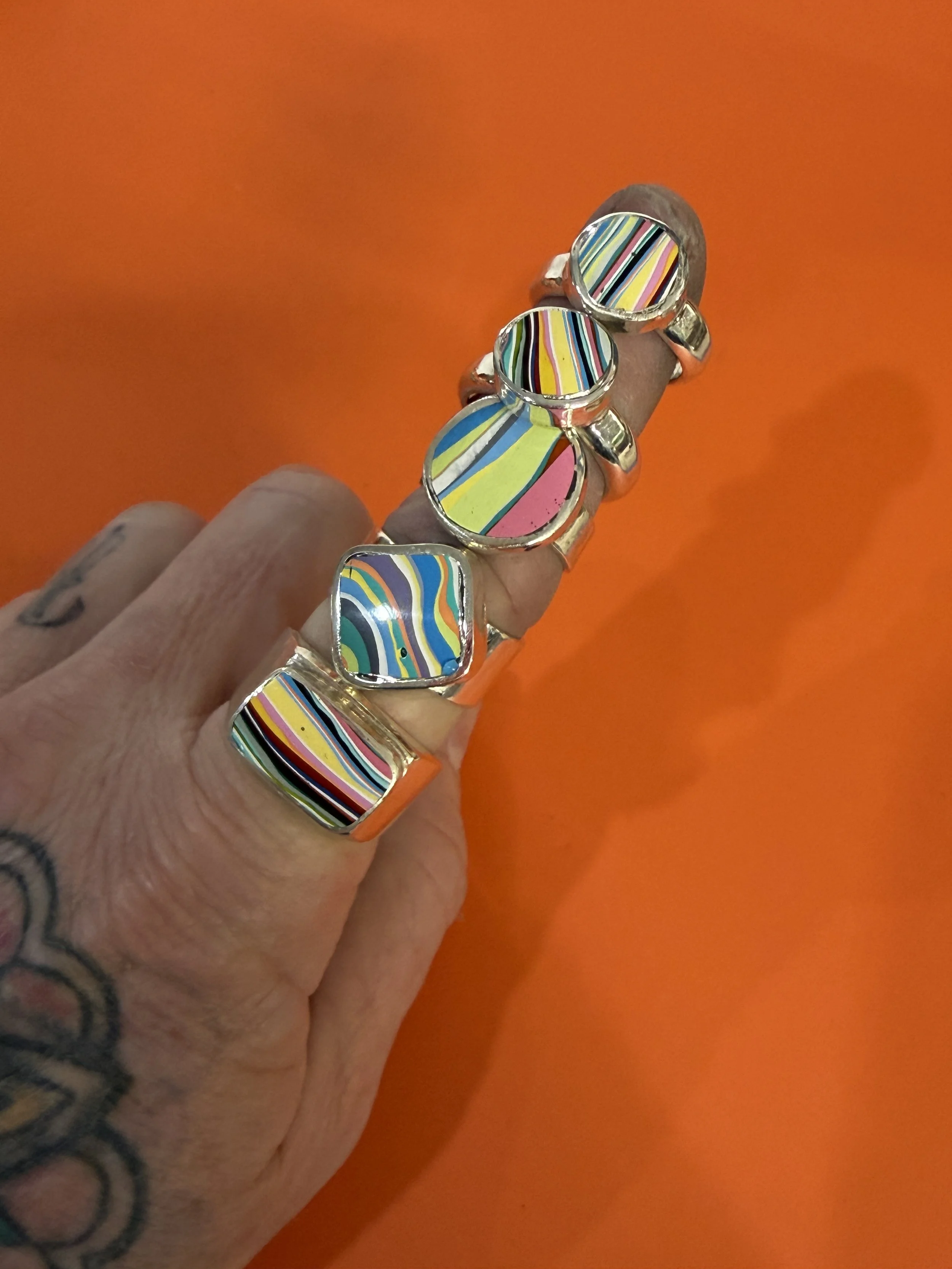 Rare, one of a kind piece of Lynch Street Fordite Set in a Handmade Sterling Silver setting in your size.