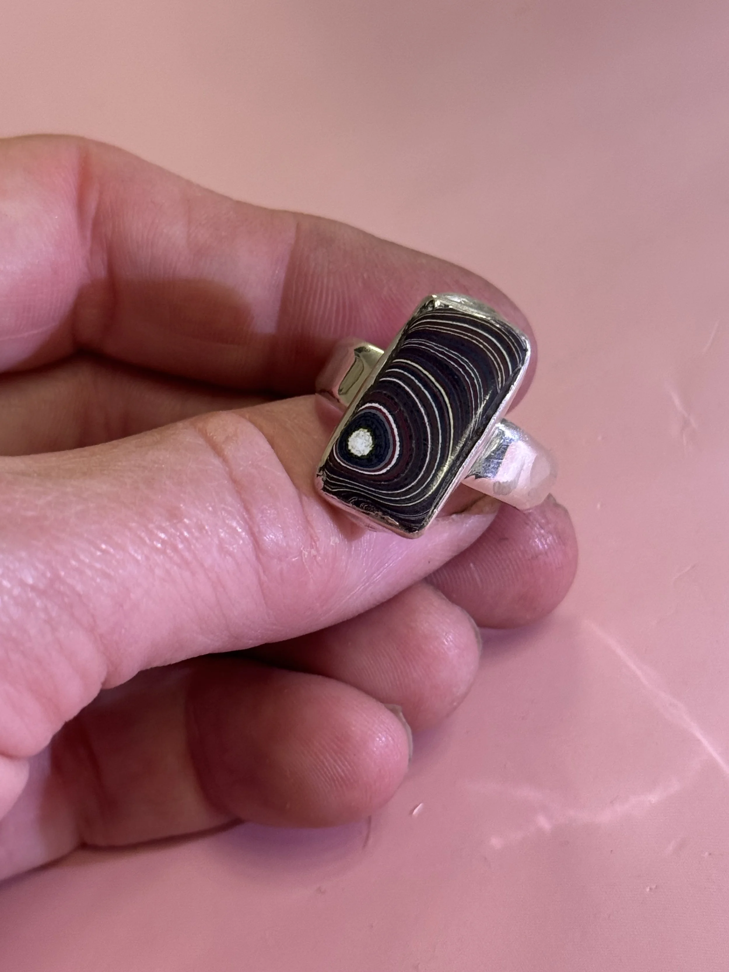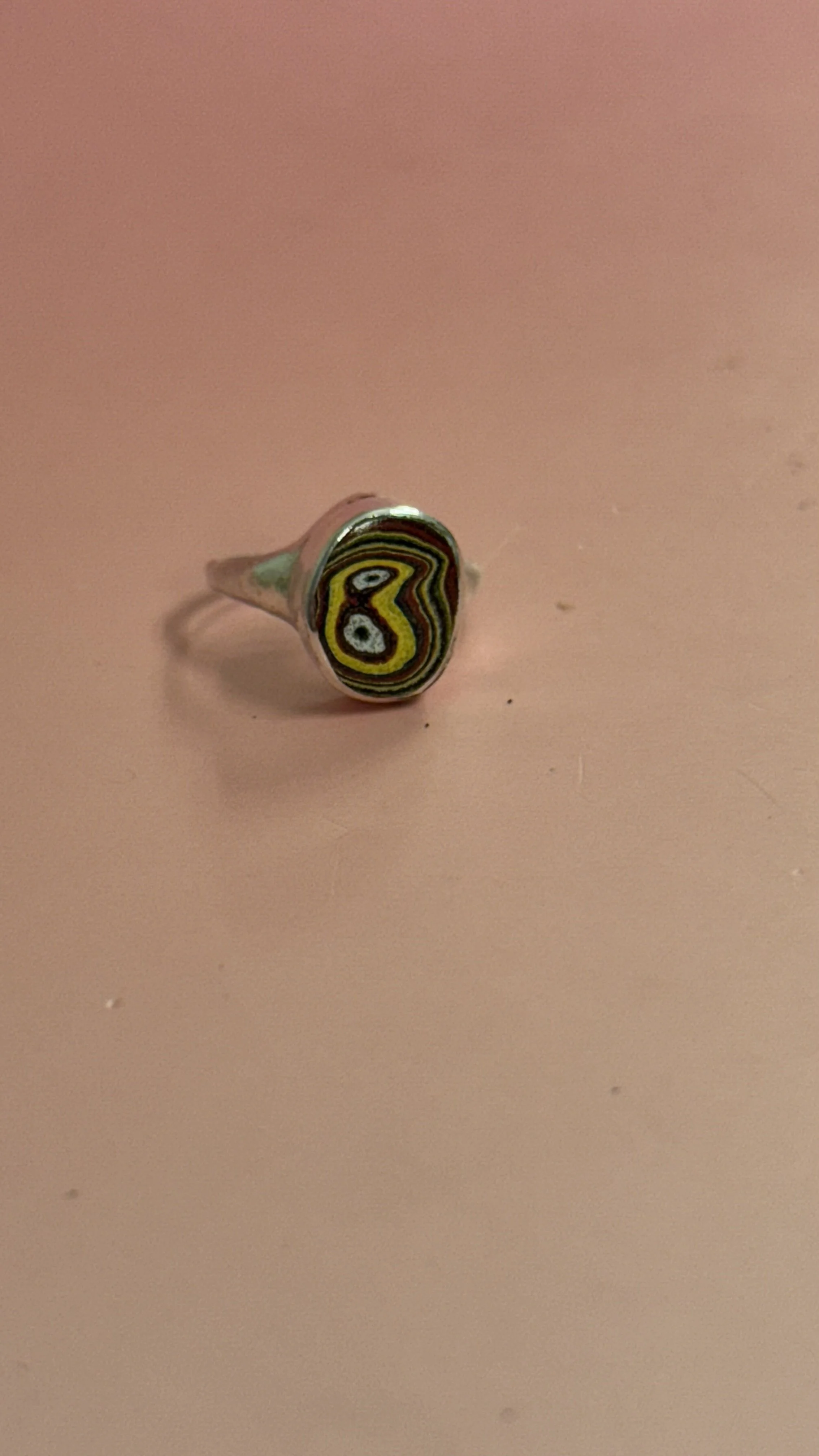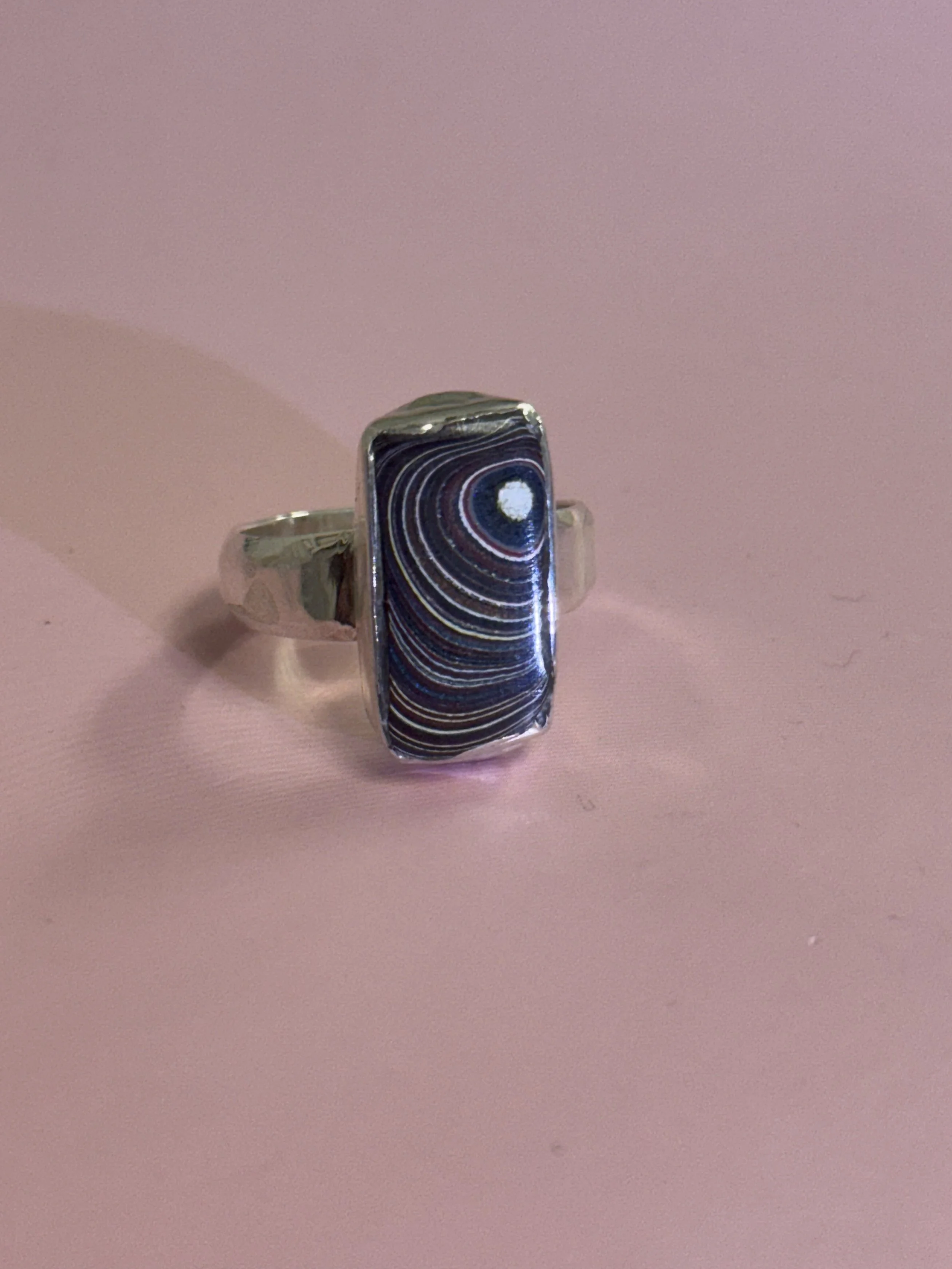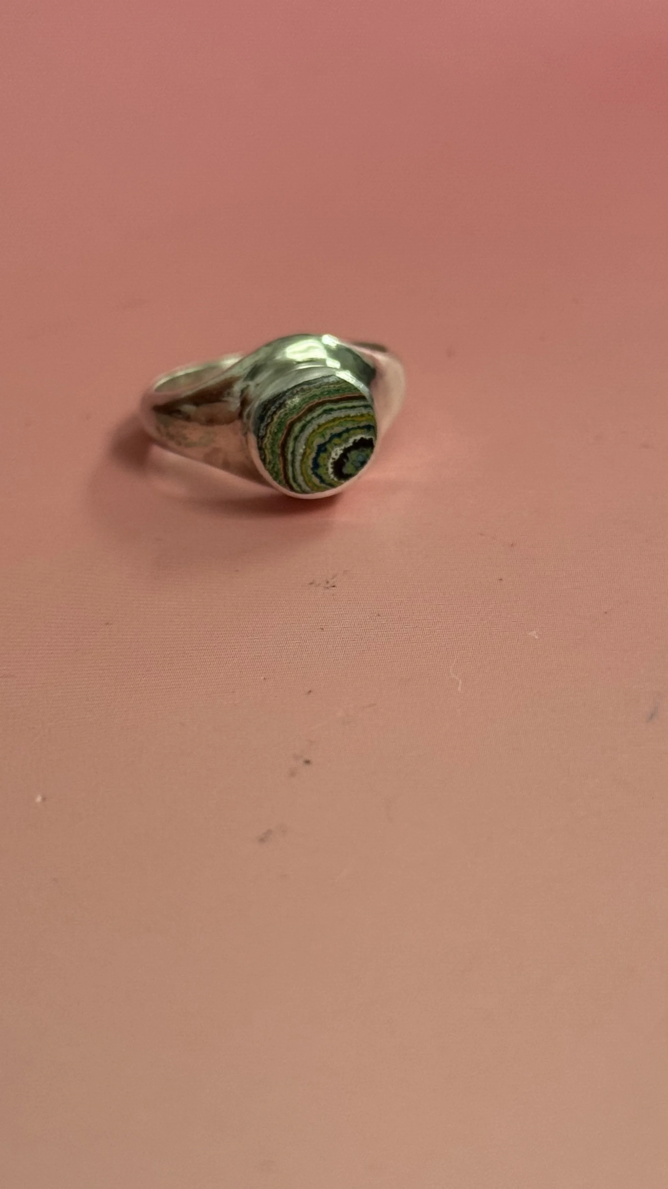 Someone will enjoy this authentic 1960’s era Detroit flawless colored totally unique patterned fordite set in a sterling silver band. It’s a stunner.