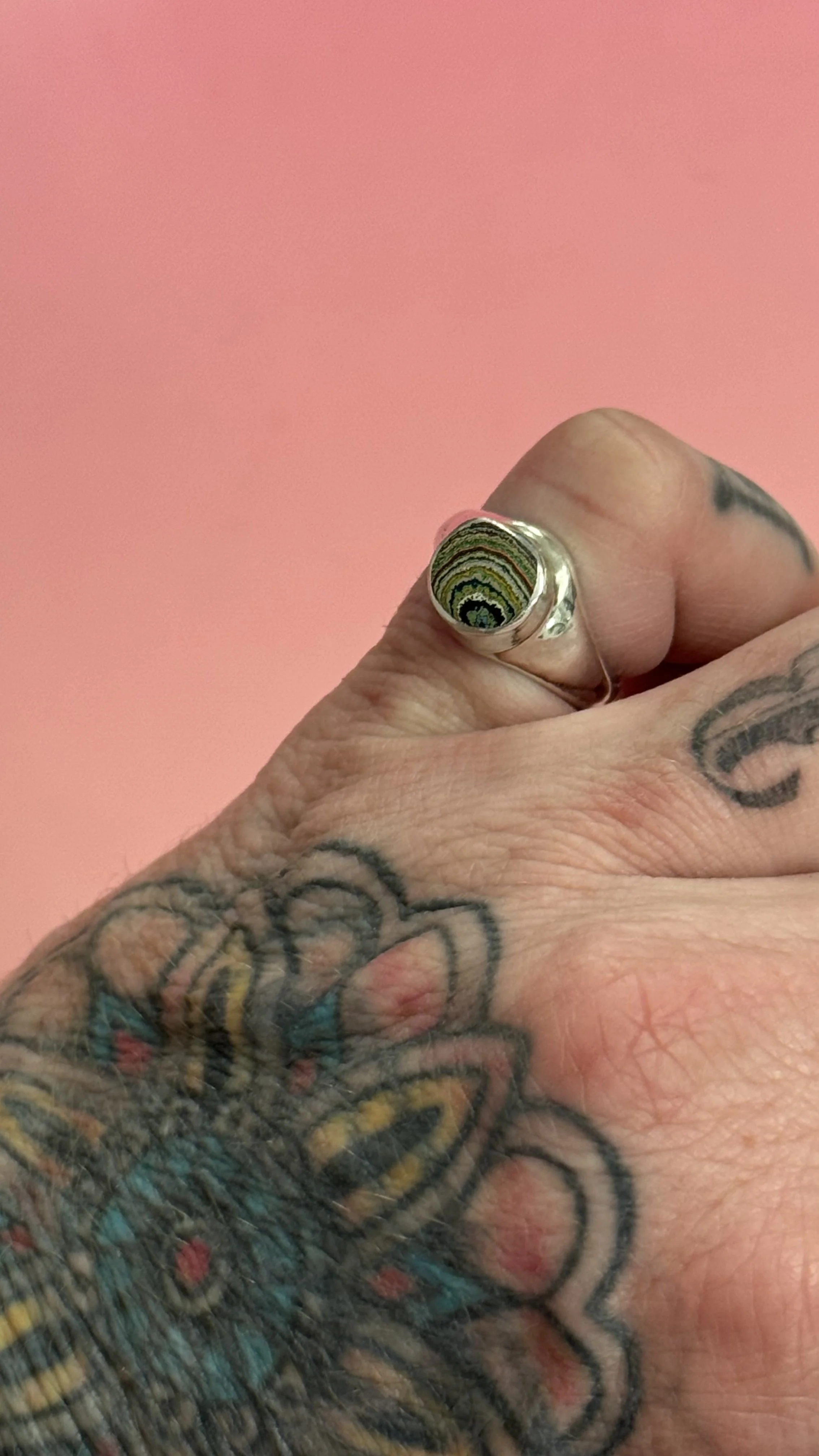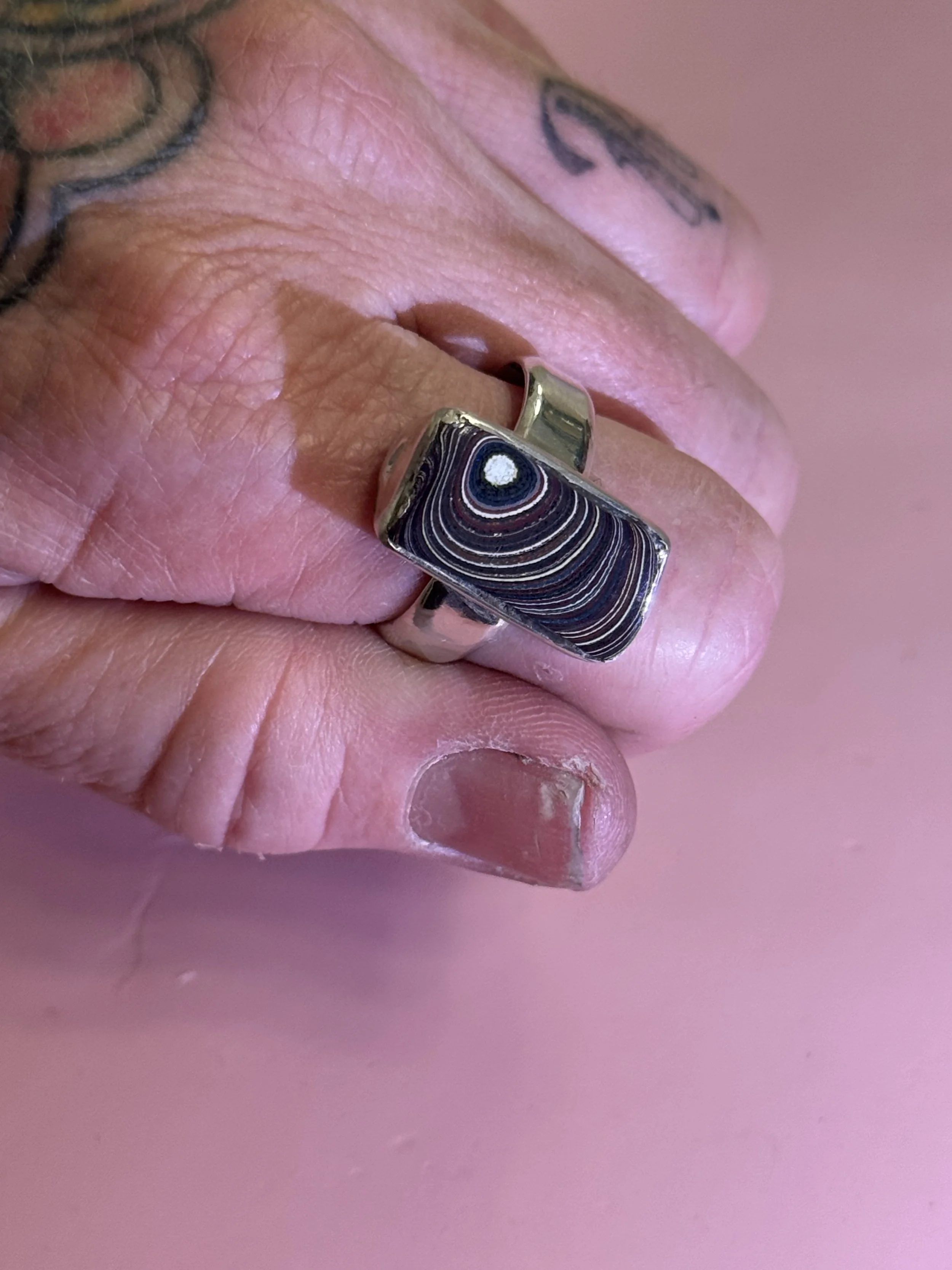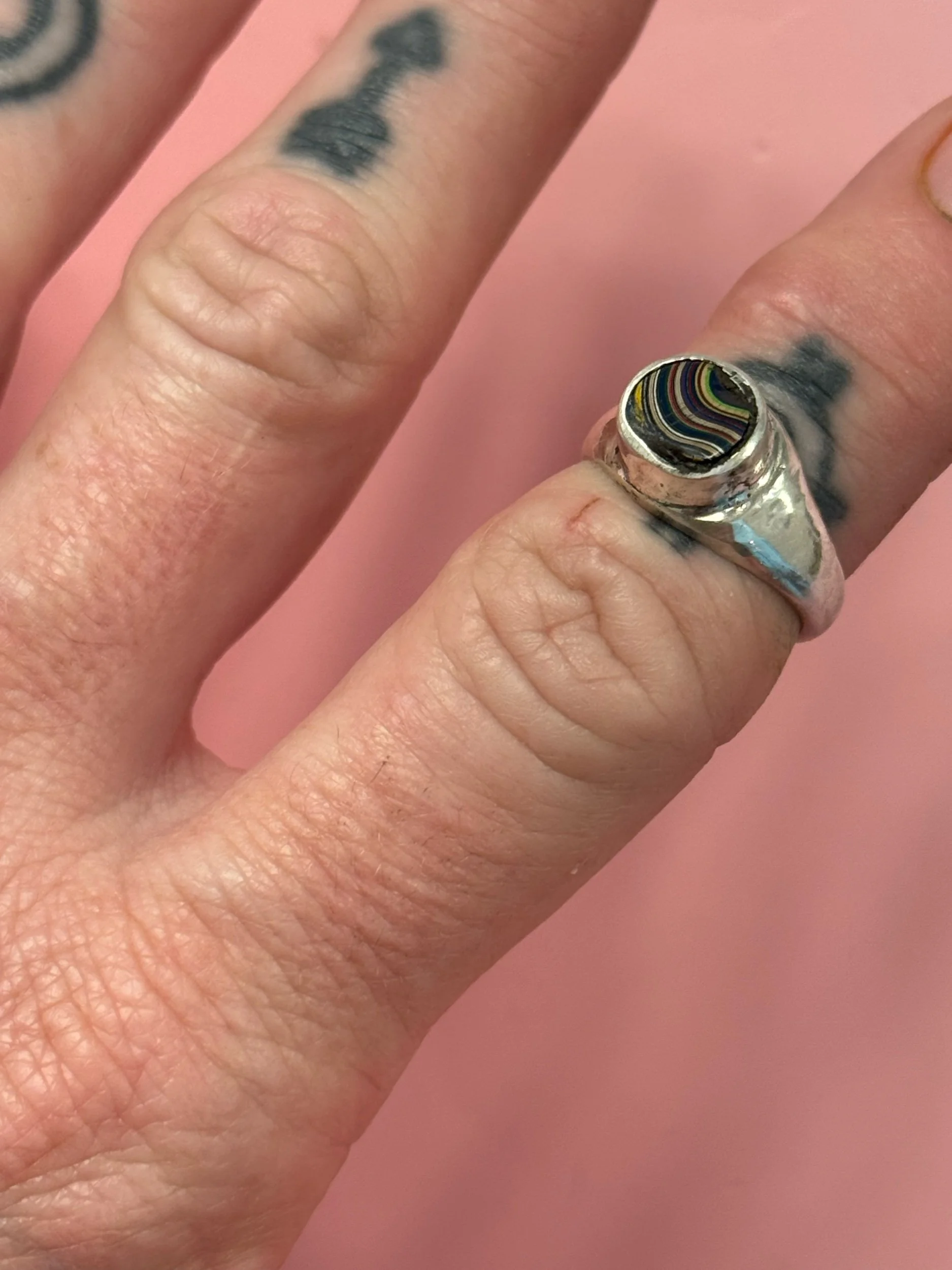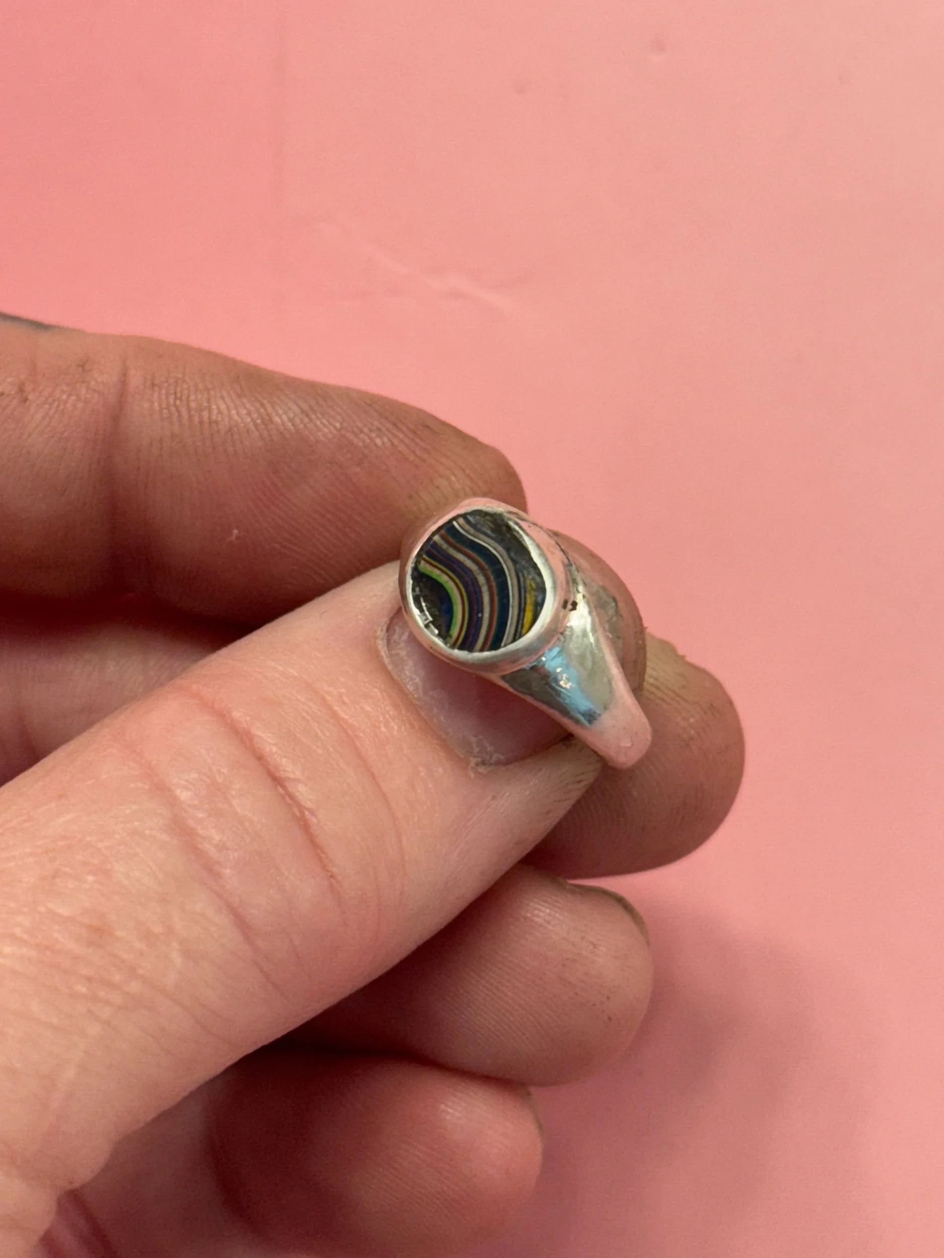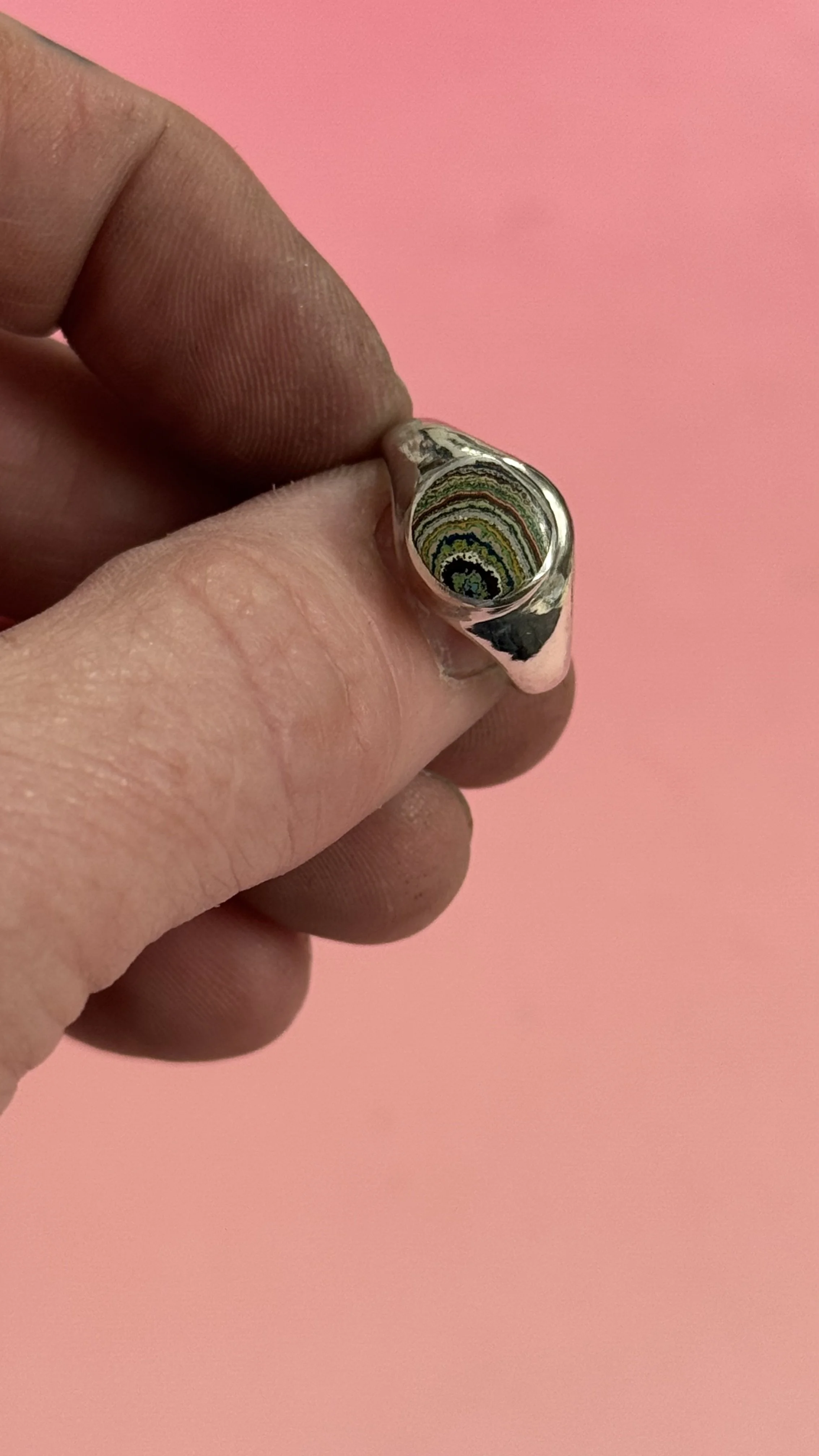 Someone will enjoy this authentic 1960’s era Detroit flawless colored totally unique patterned fordite set in a sterling silver band. It’s a stunner.