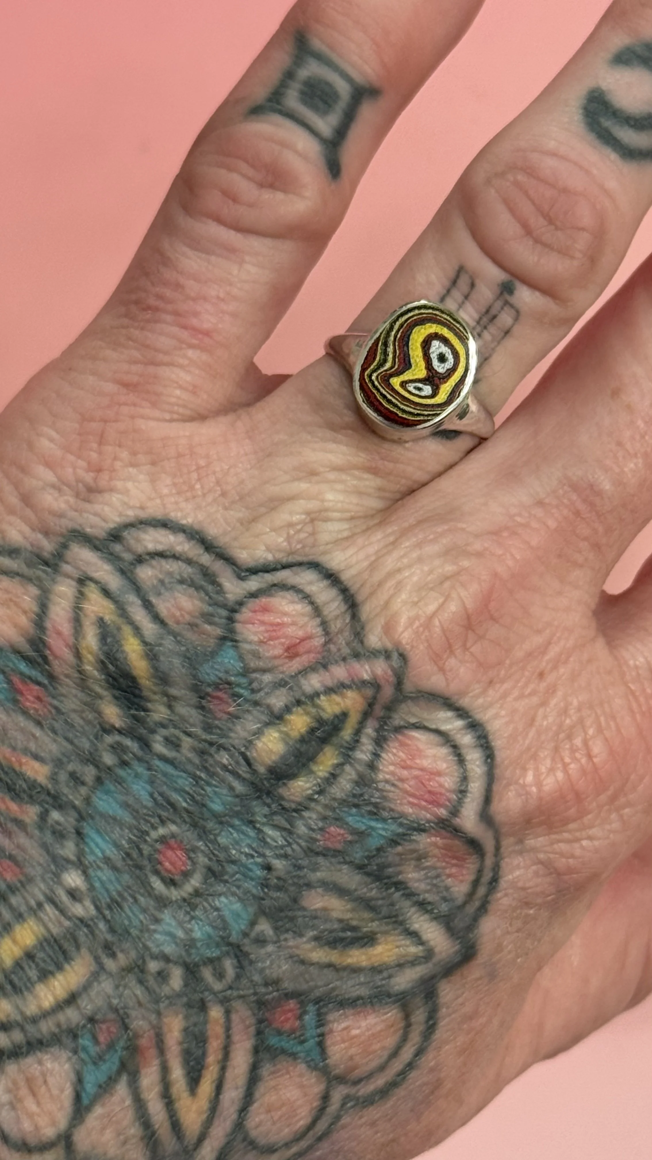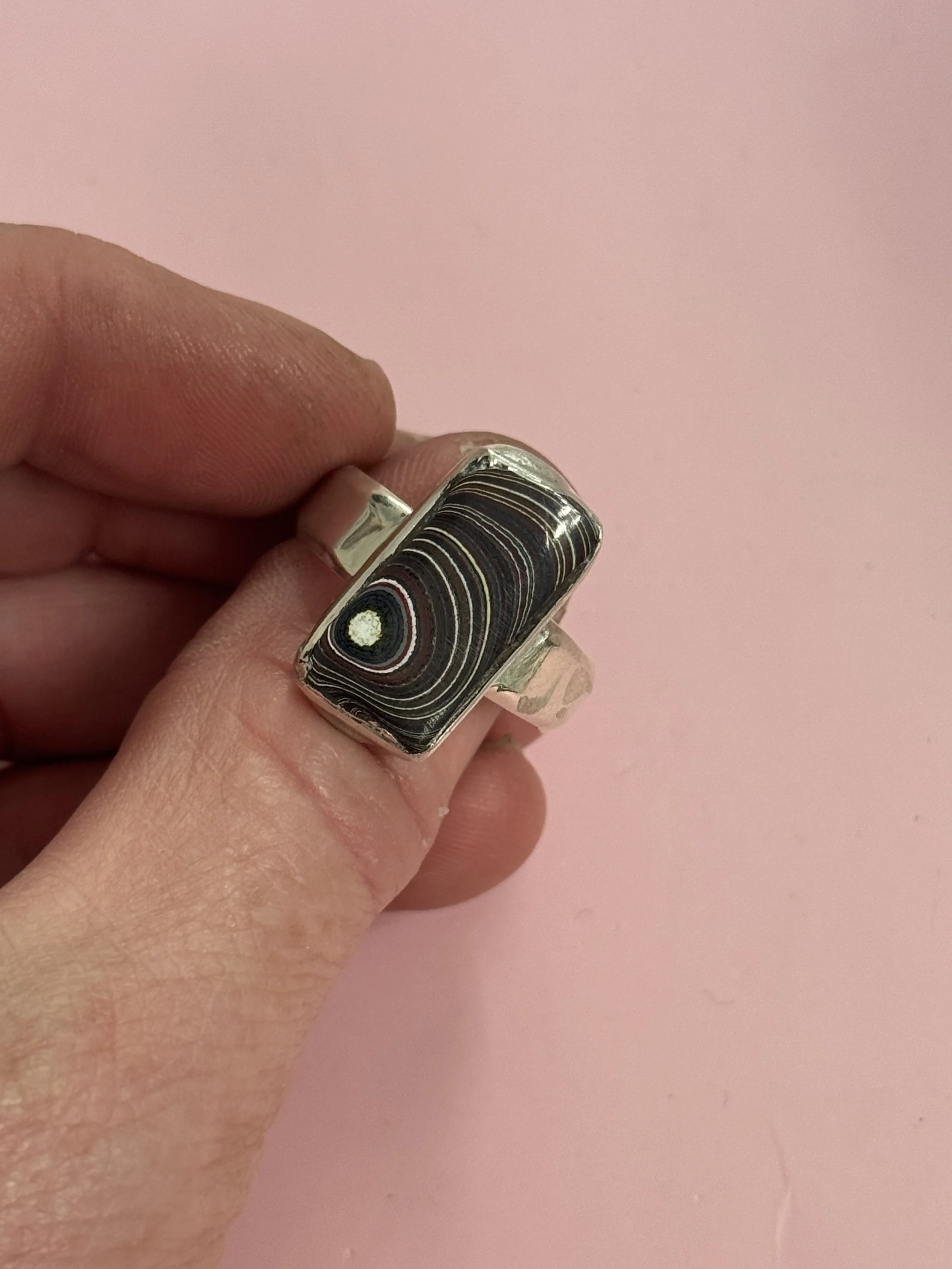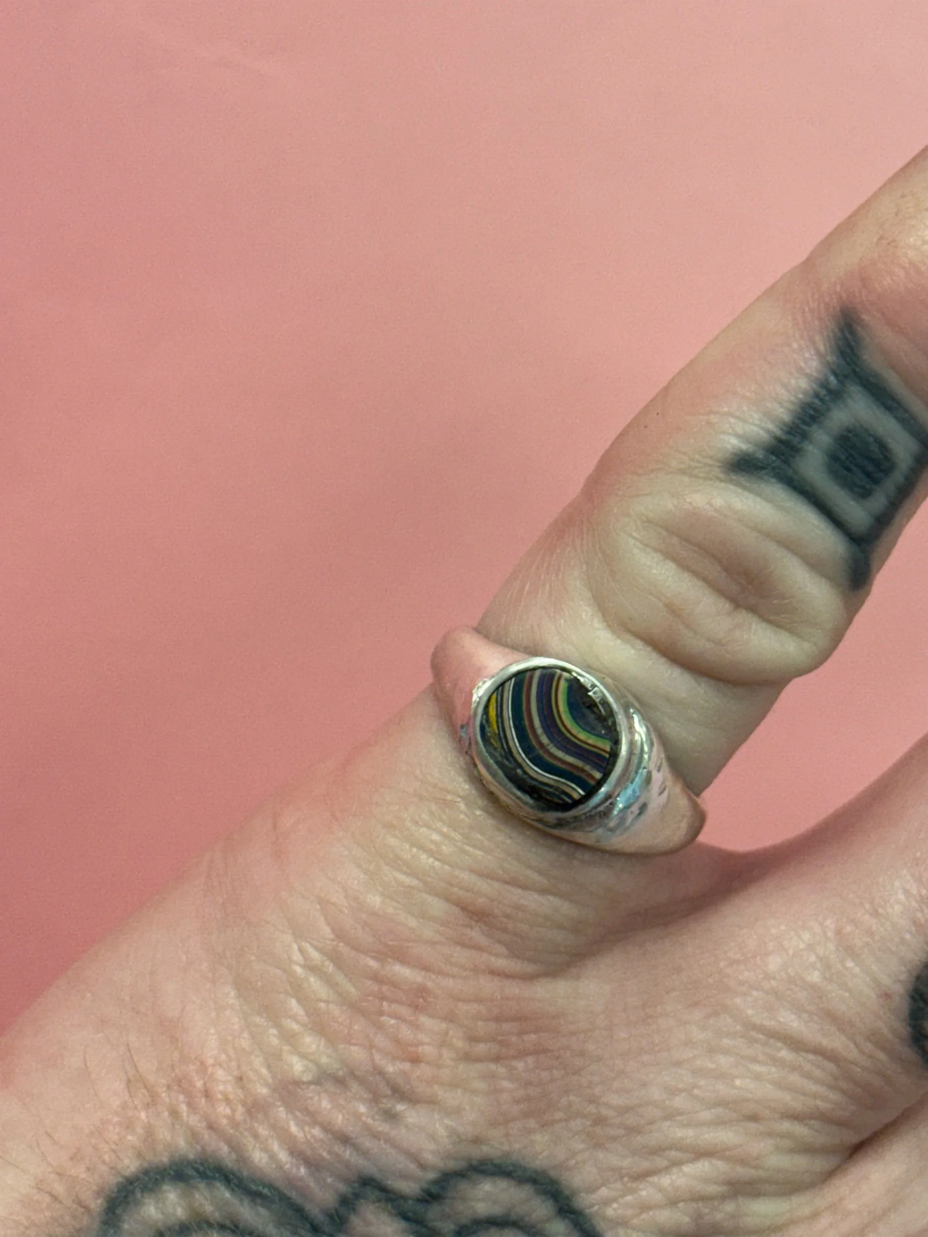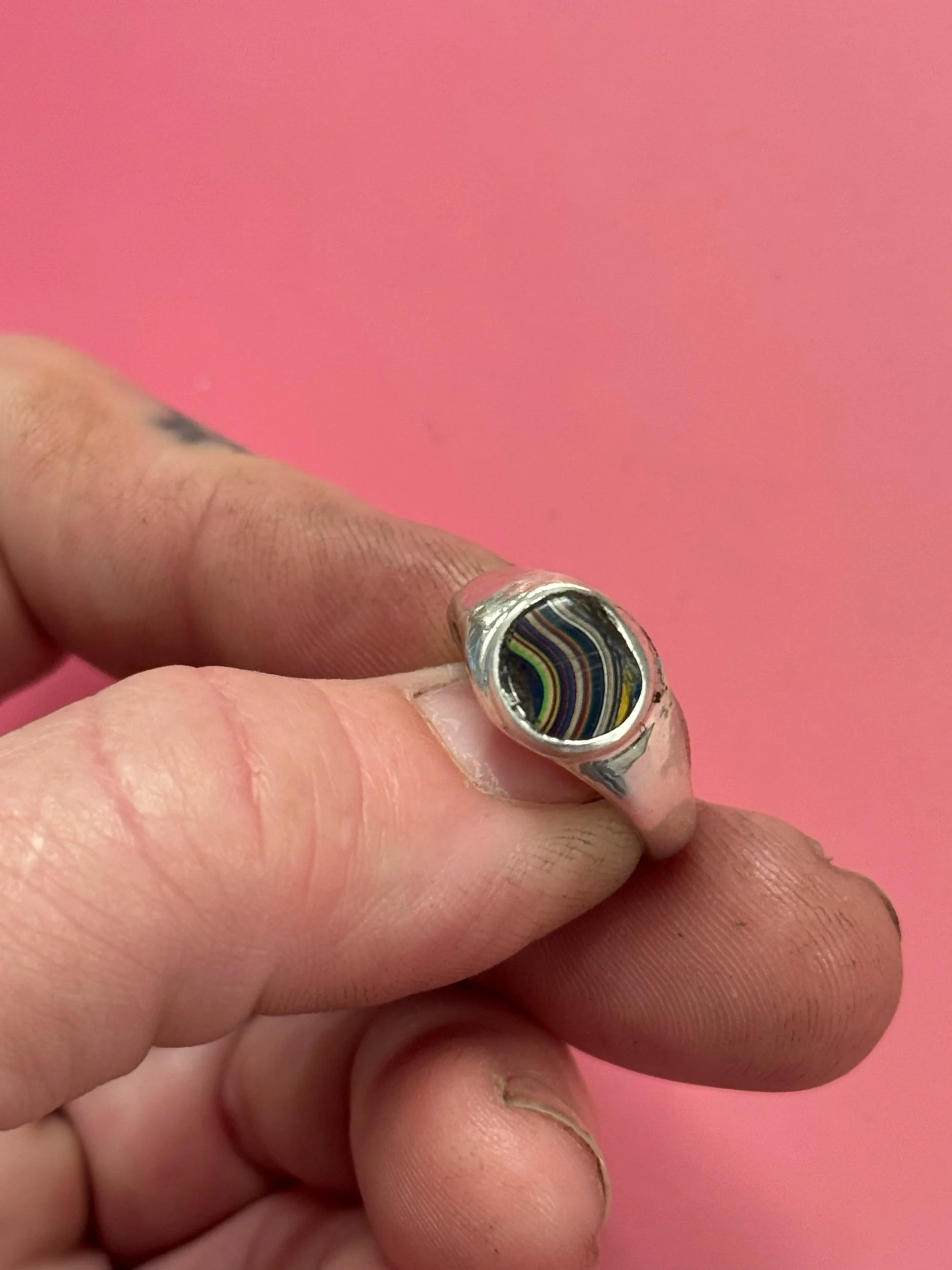 Someone will enjoy this authentic 1960’s era Detroit flawless colored totally unique patterned fordite set in a sterling silver band. It’s a stunner.
