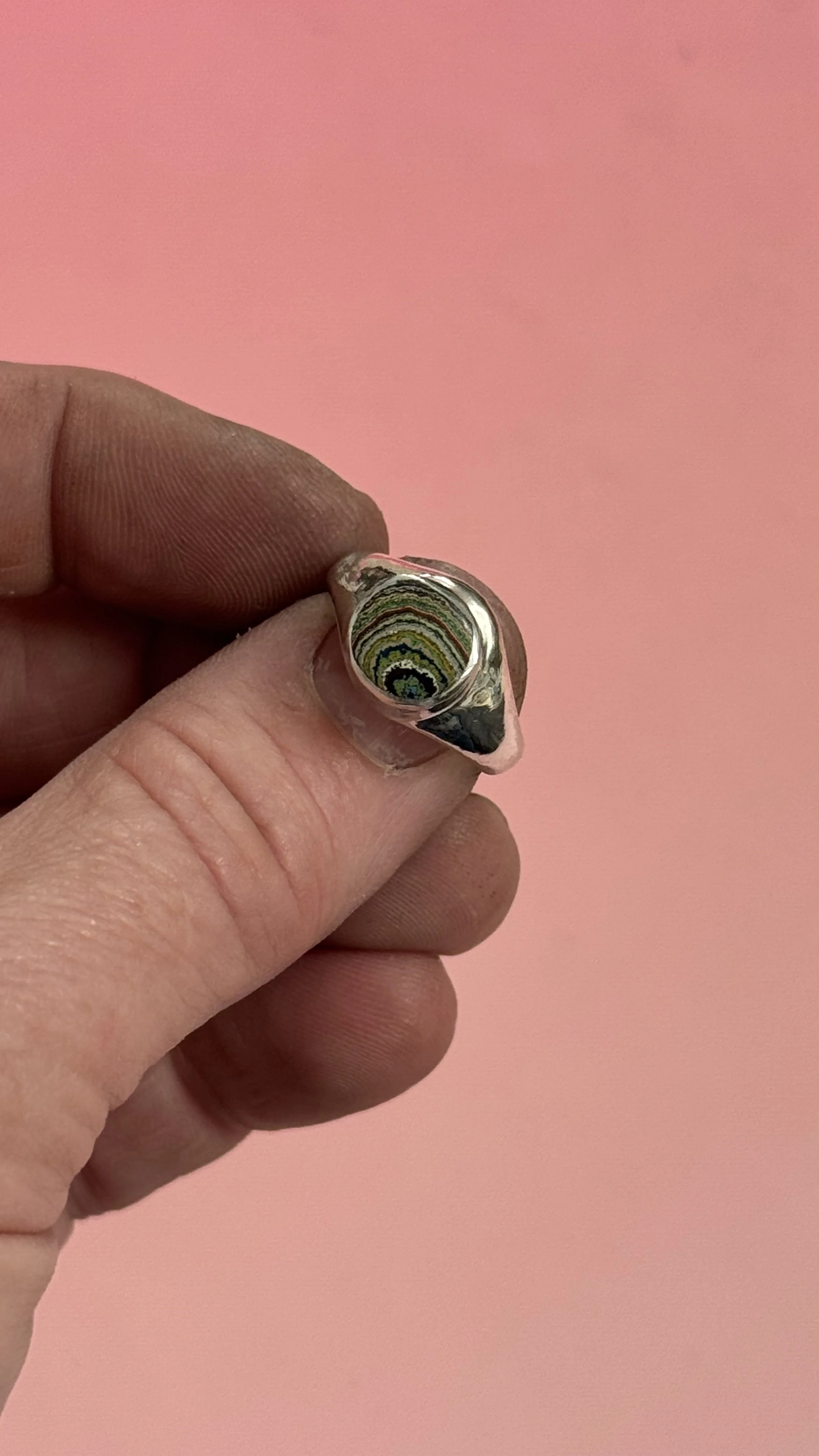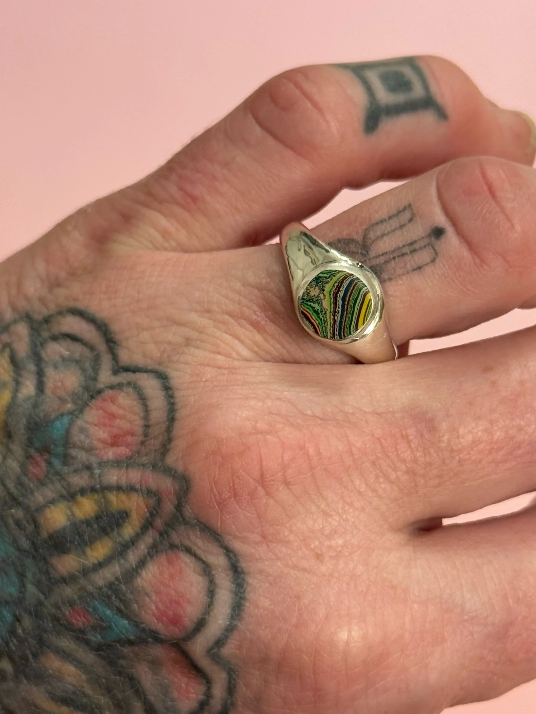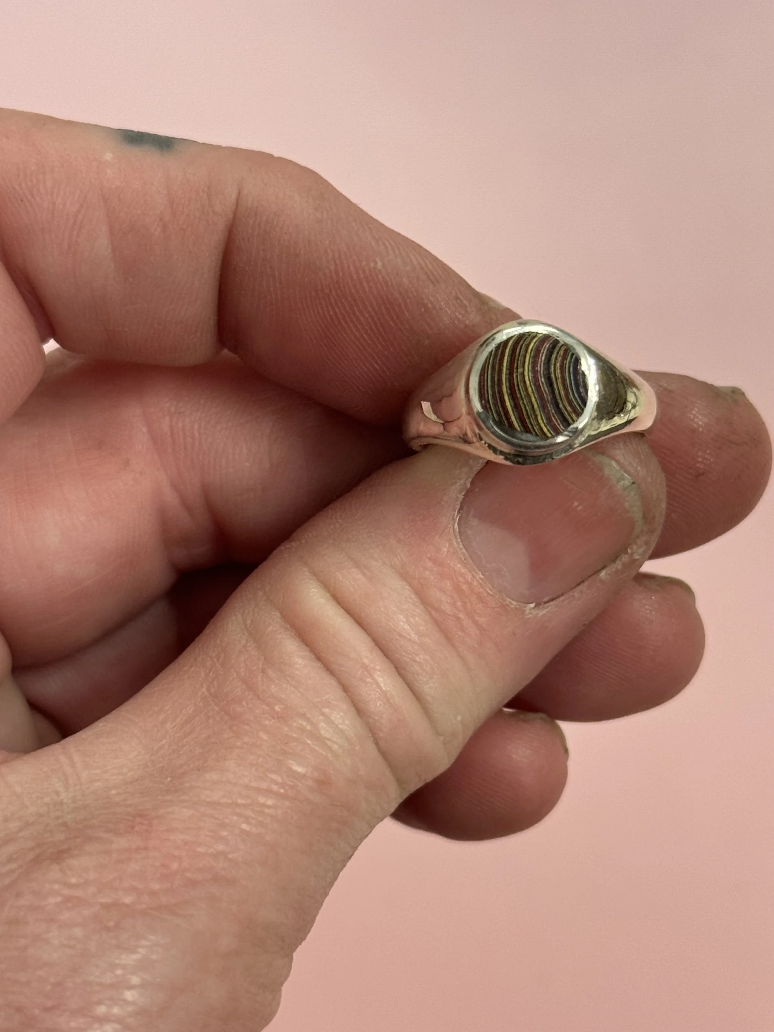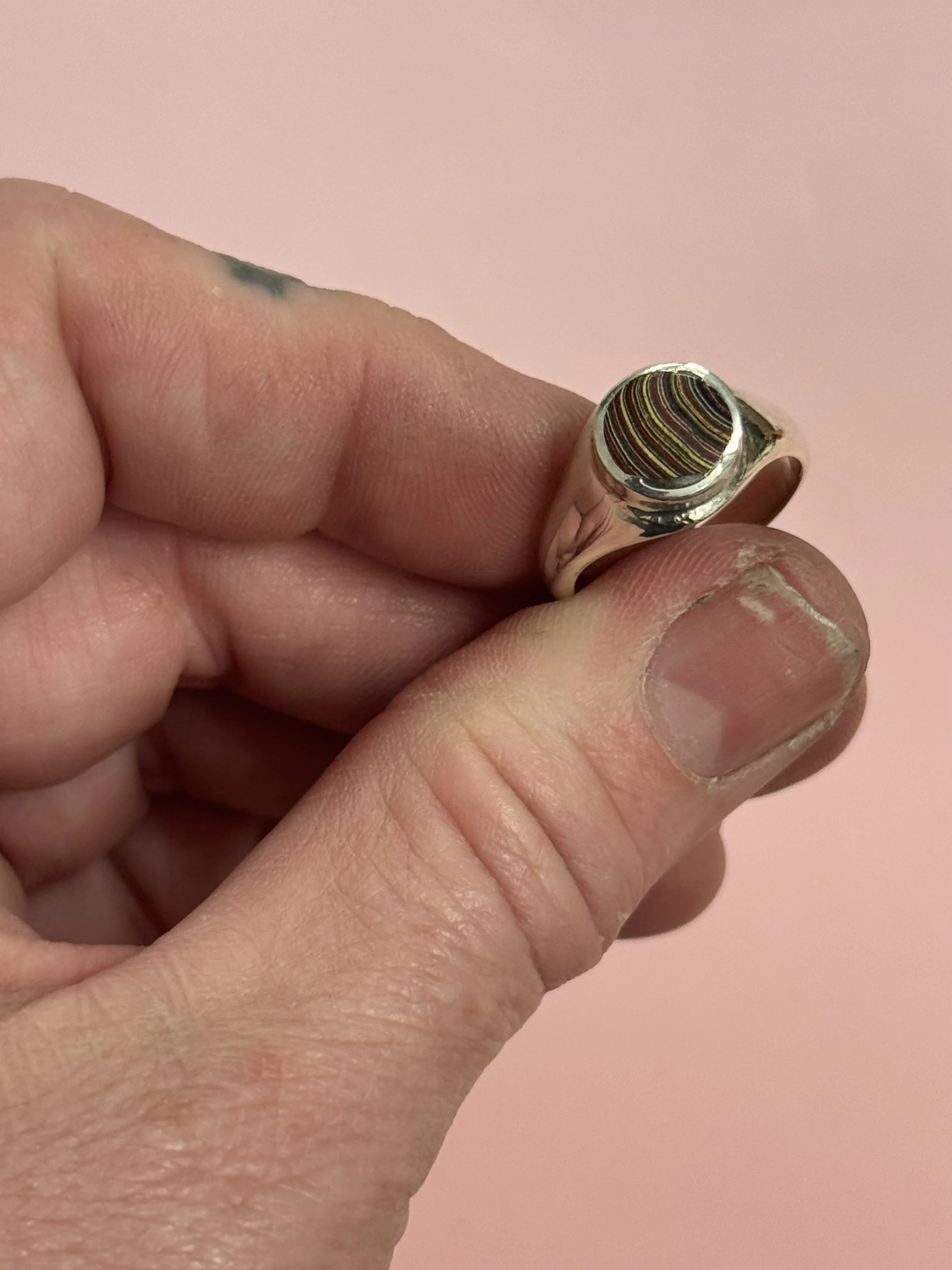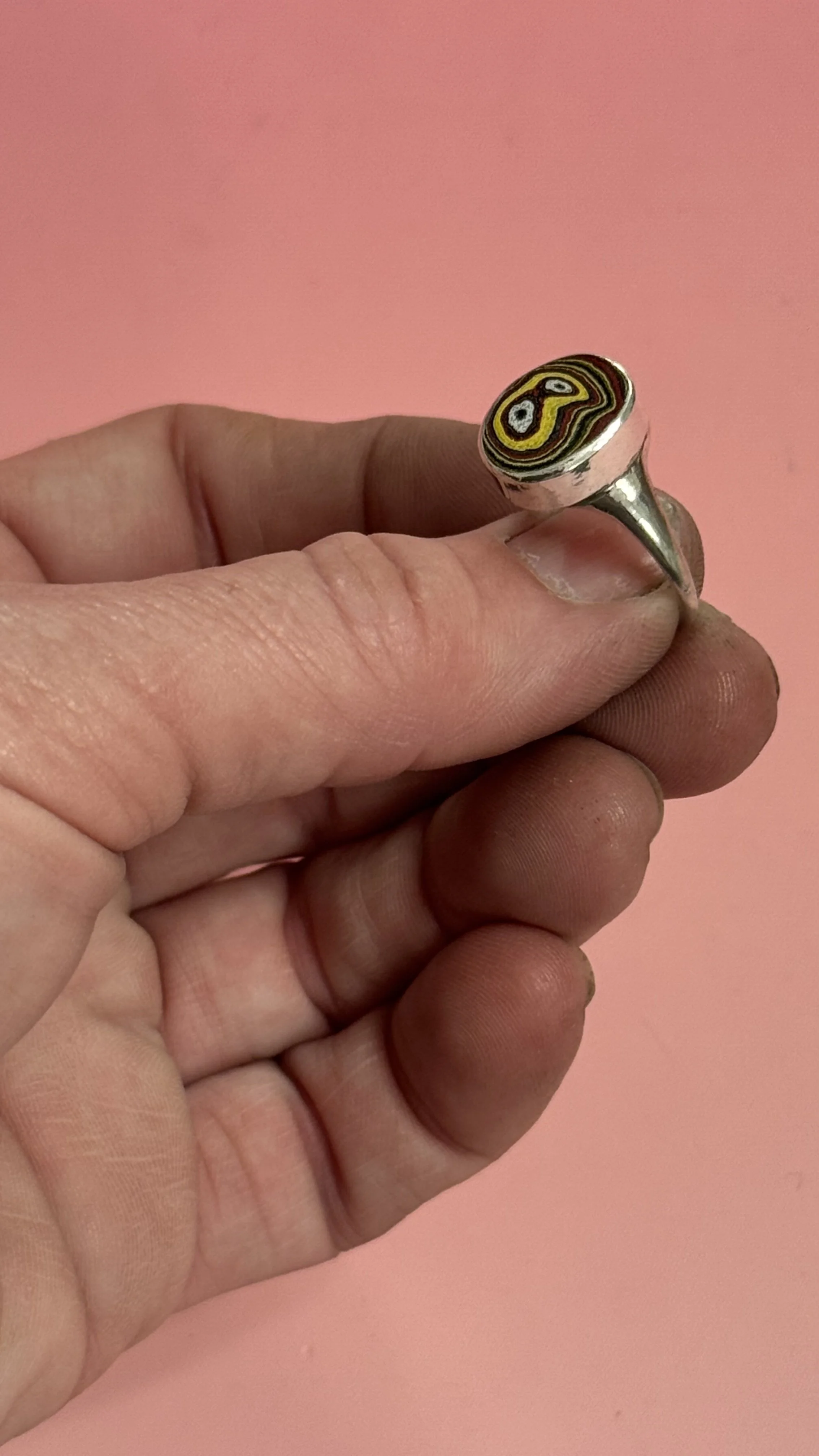Someone will enjoy this authentic 1960’s era Detroit flawless colored totally unique patterned fordite set in a sterling silver band. It’s a stunner.