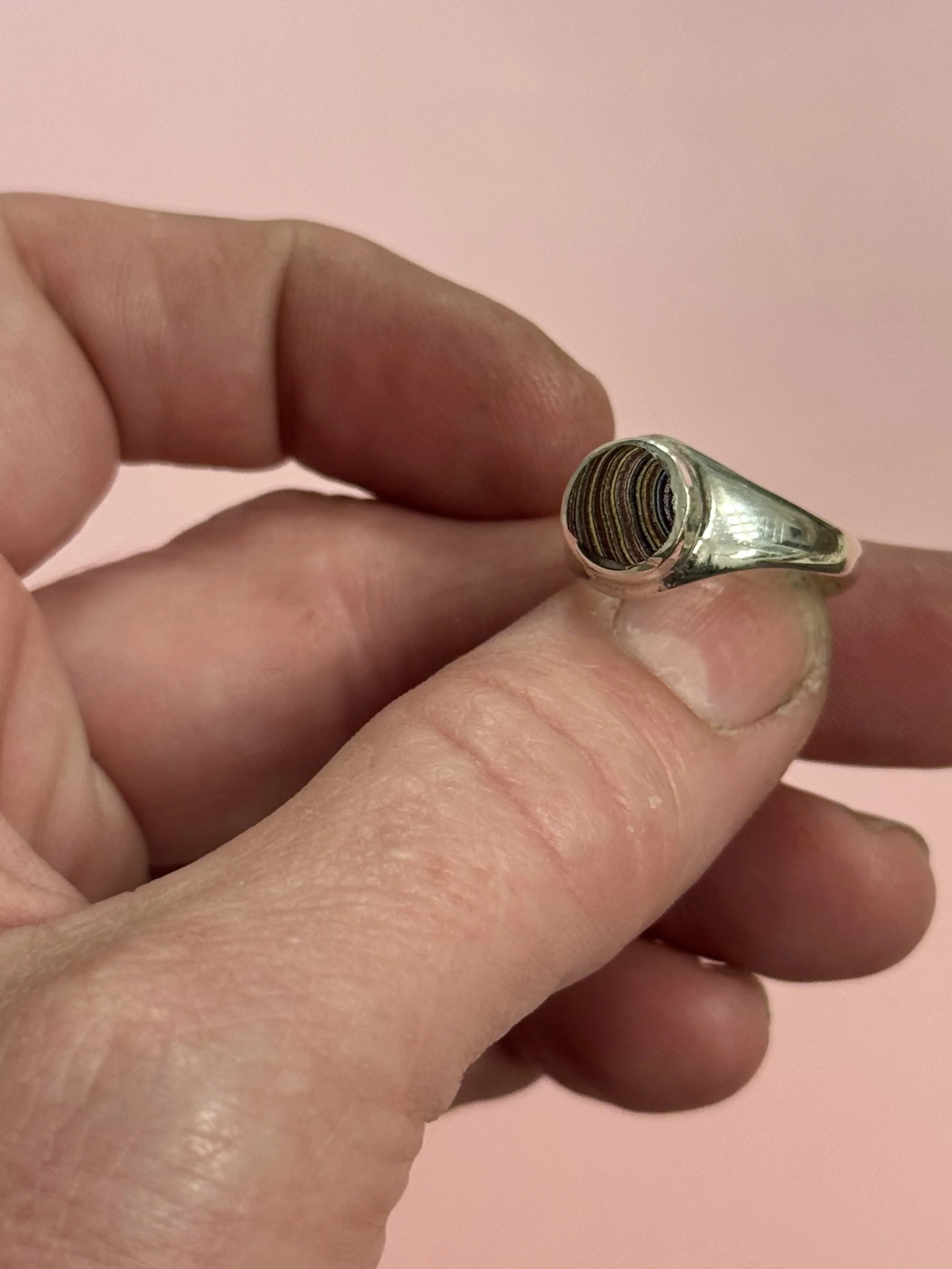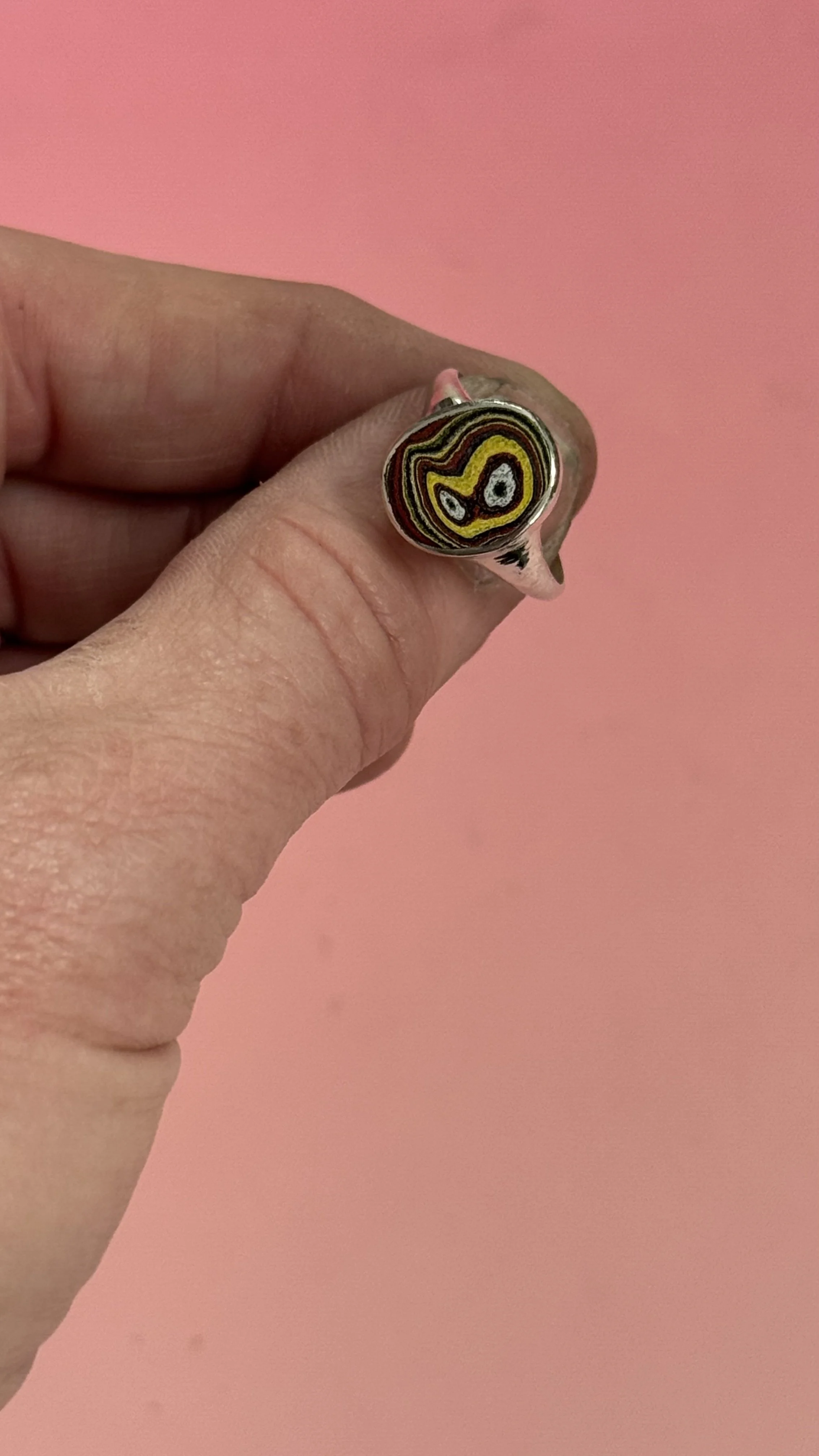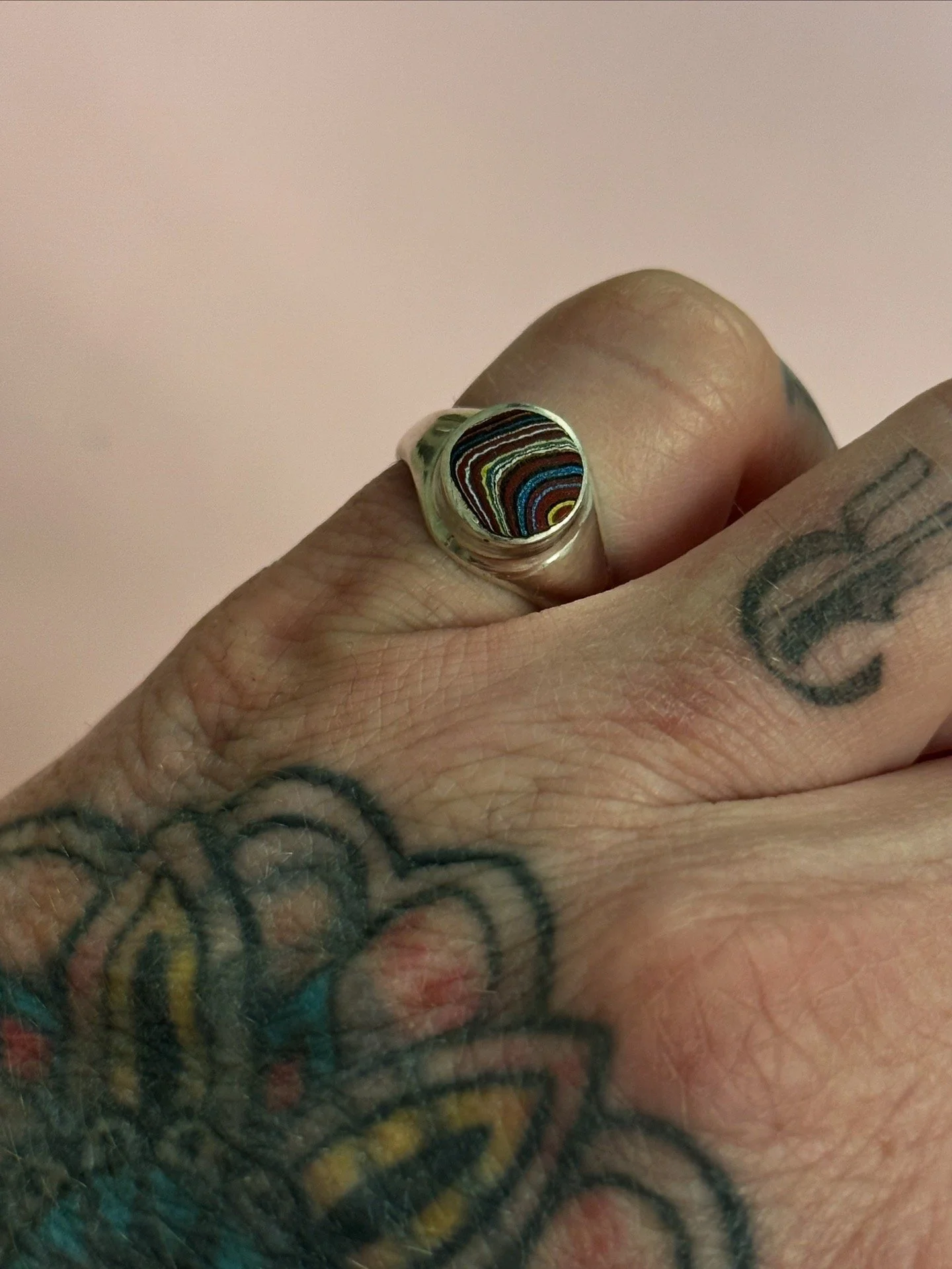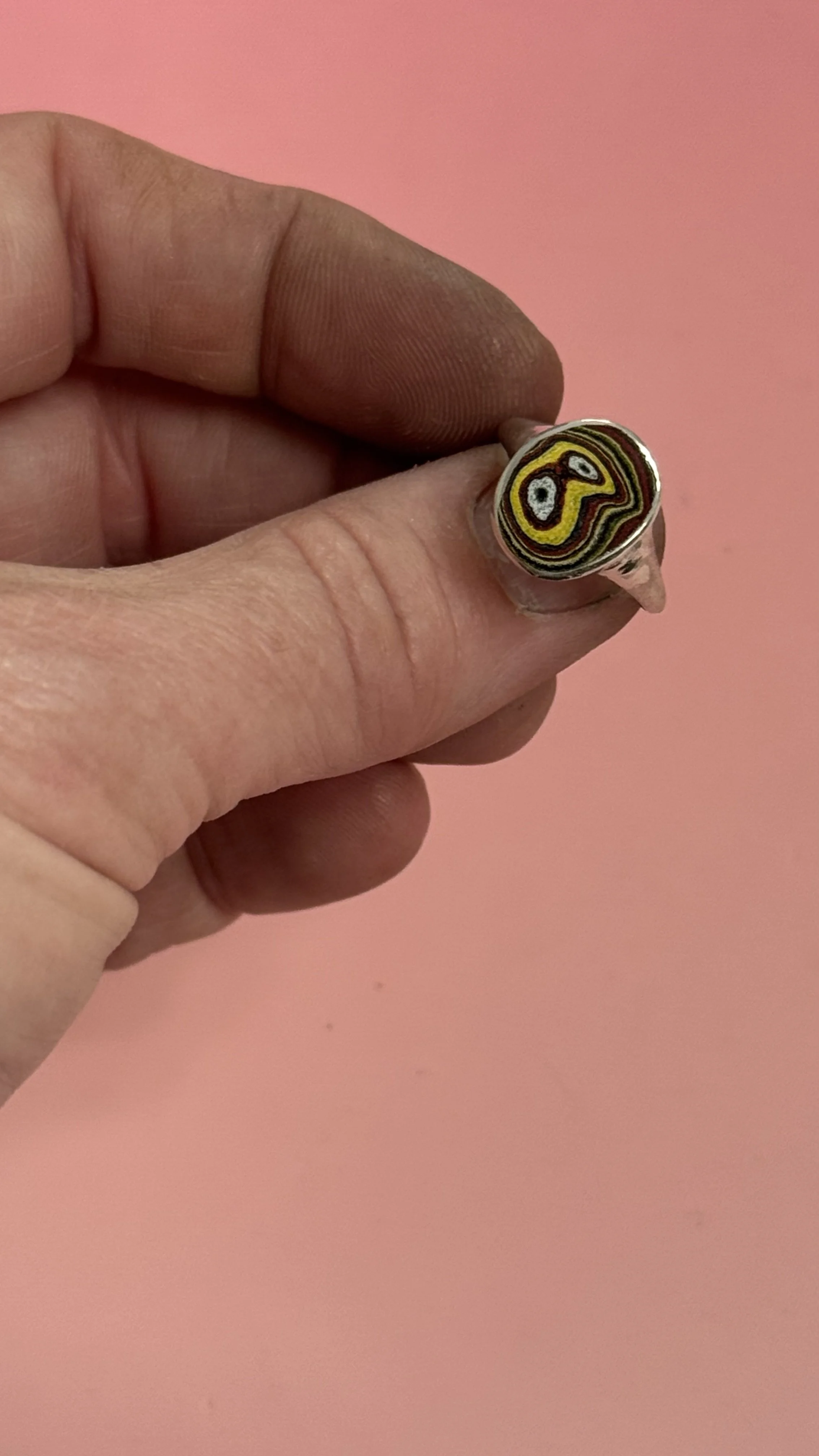 Someone will enjoy this authentic 1960’s era Detroit flawless colored totally unique patterned fordite set in a sterling silver band. It’s a stunner.