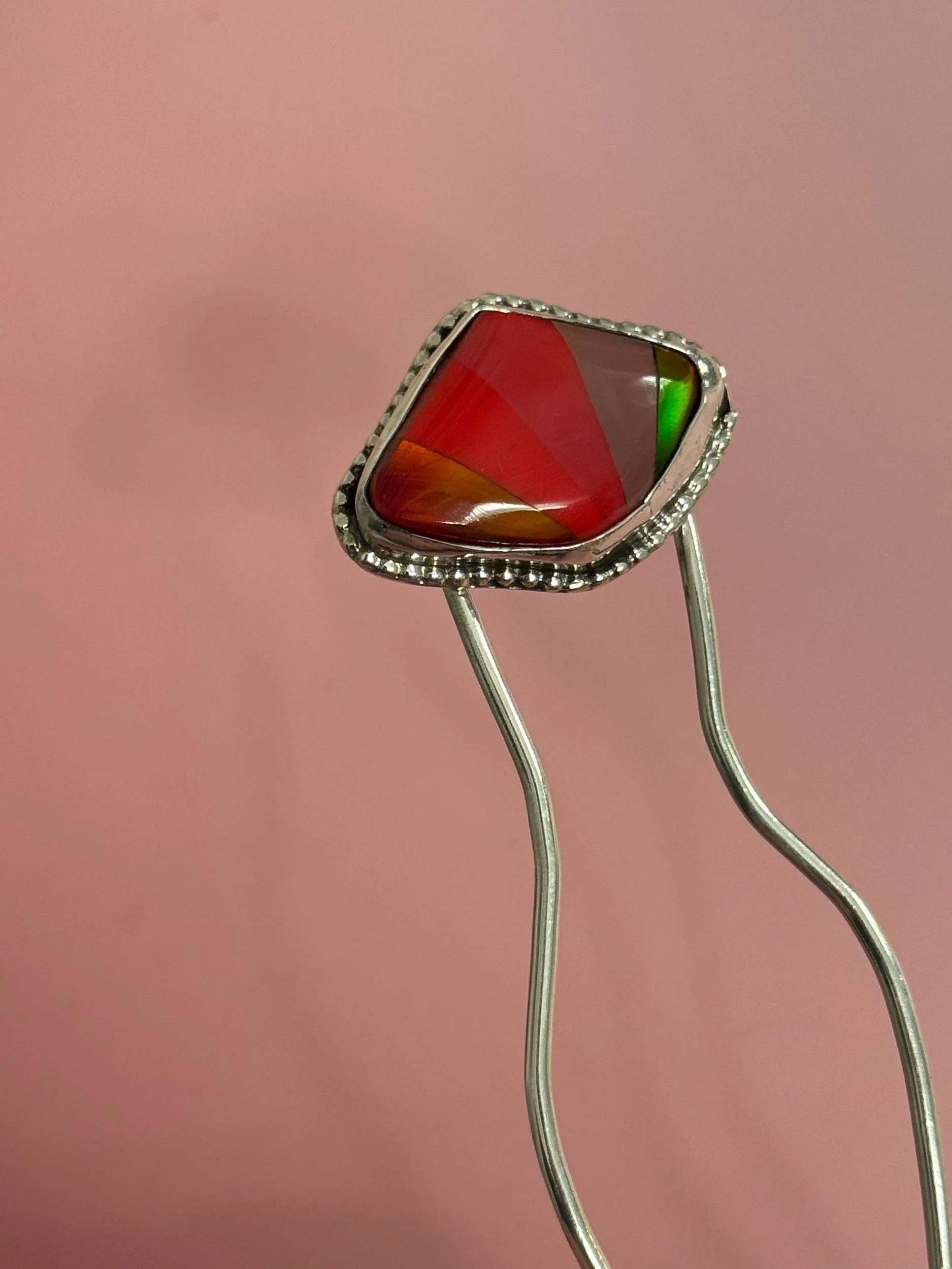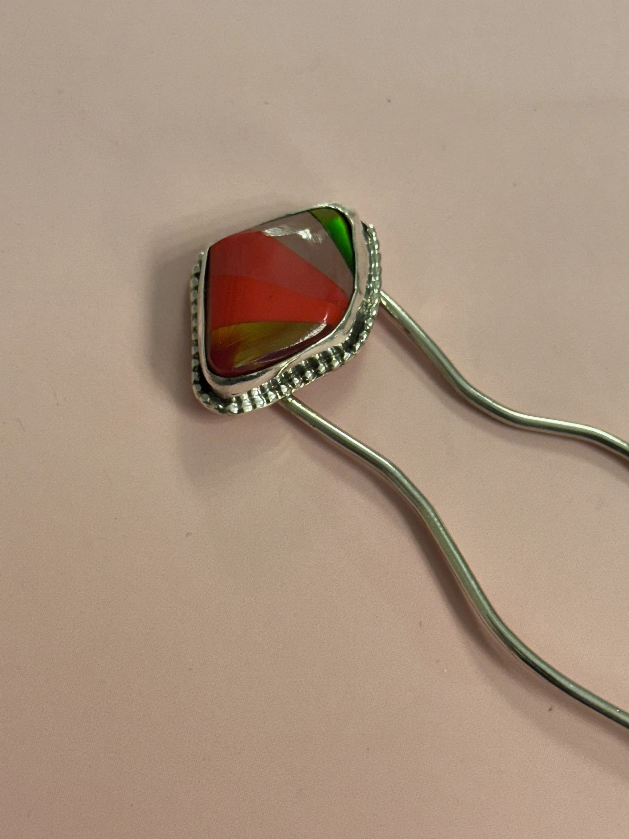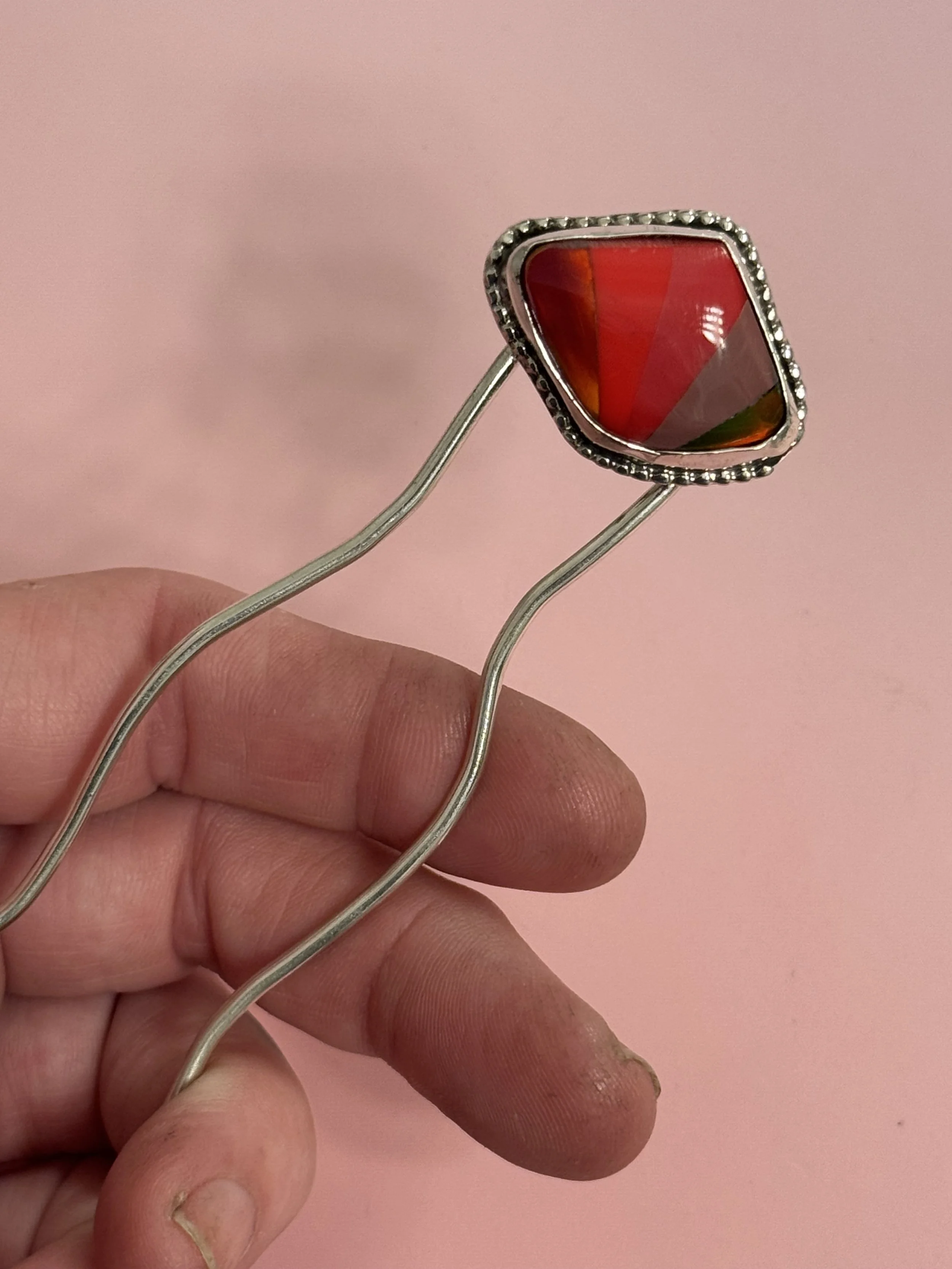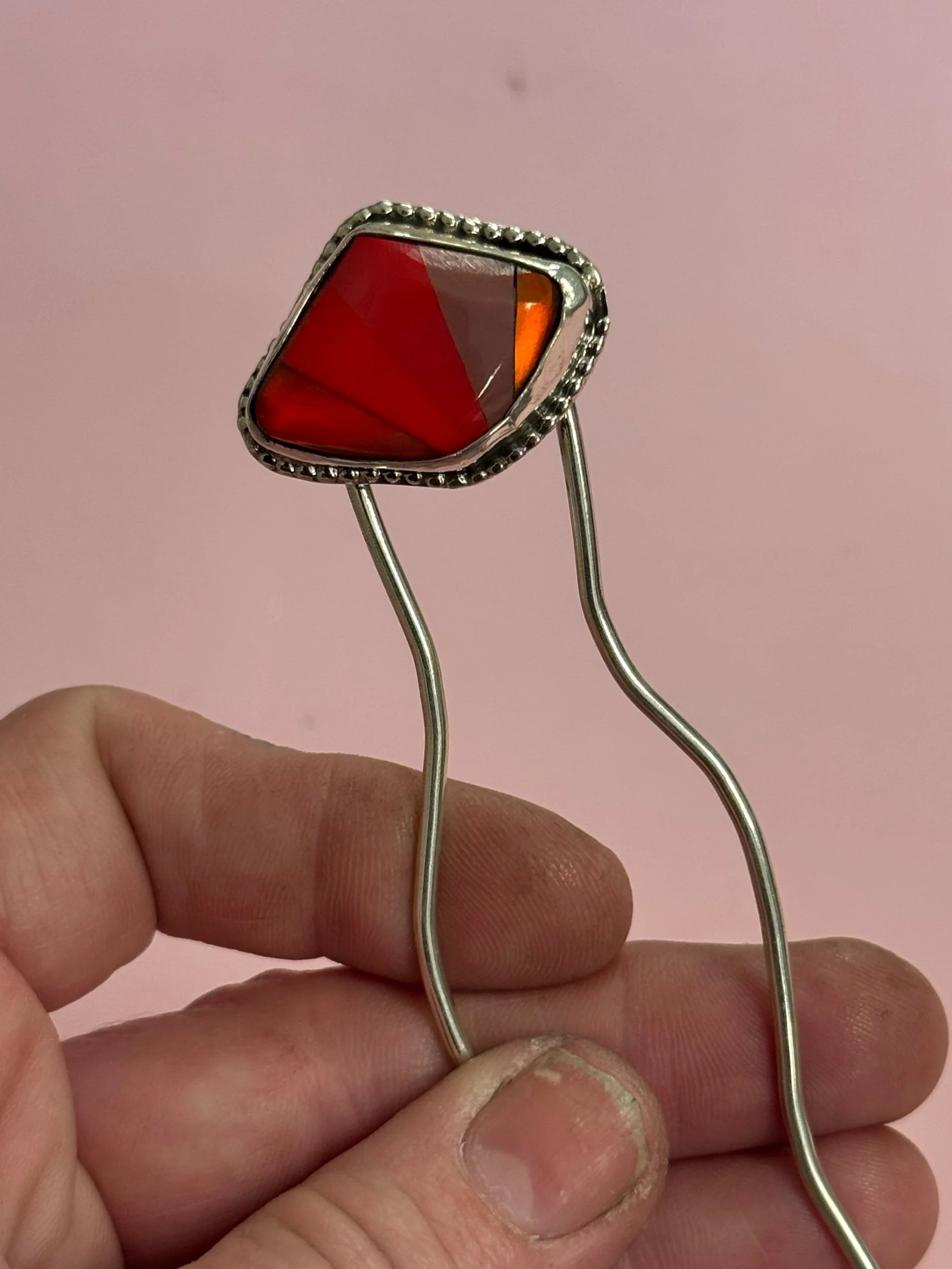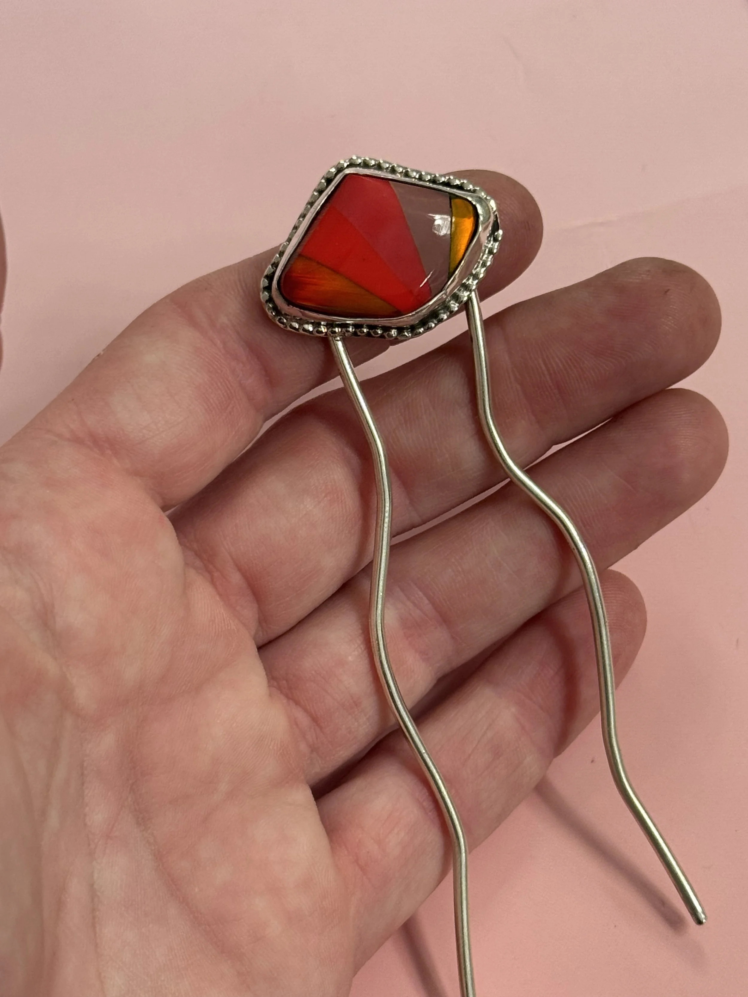 ONE SIZE FITS MOST HAIR LENGTHS AND TYPES. HAIRPIN IS SOLID, THICK GAUGE WORK HARDENED SILVER WITH ROUNDED TIPS MEASURING 4”.
