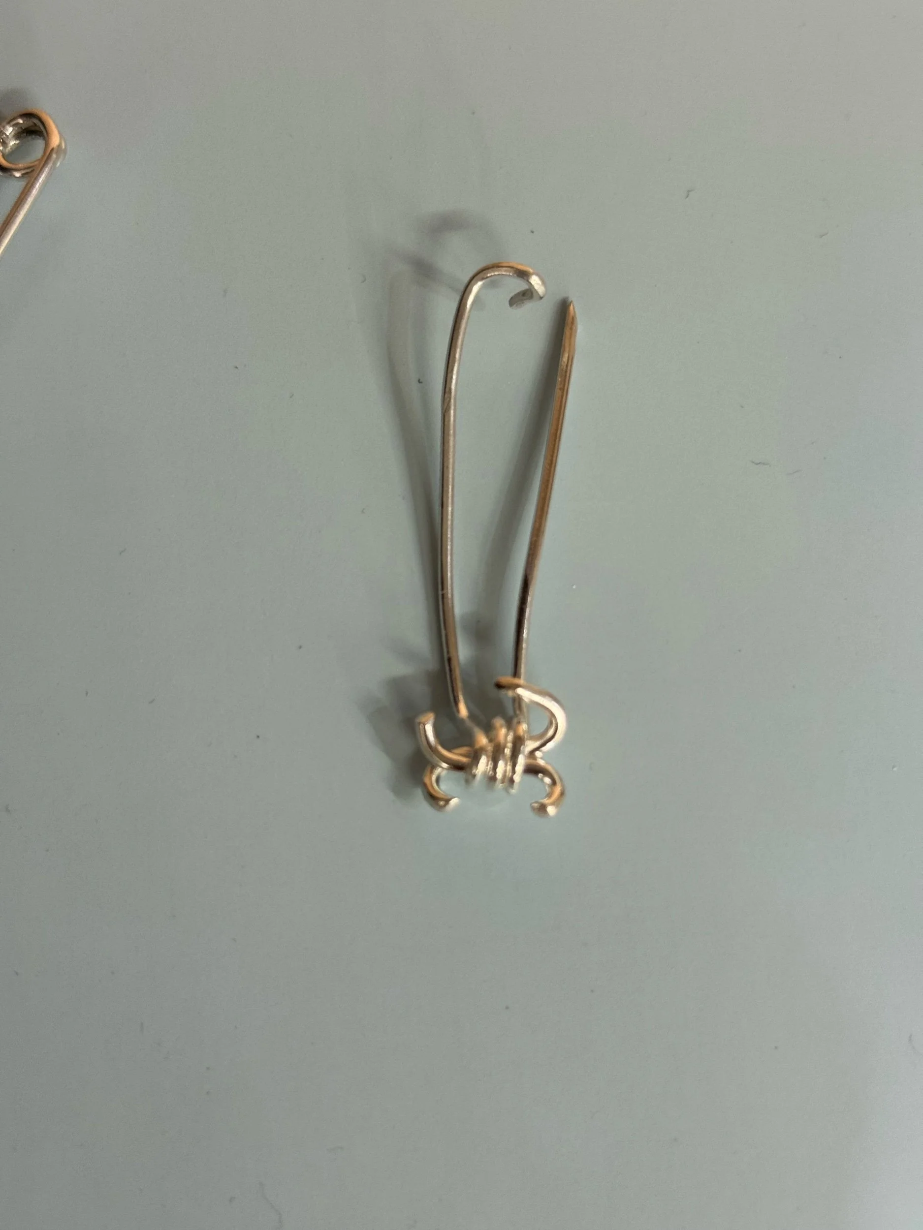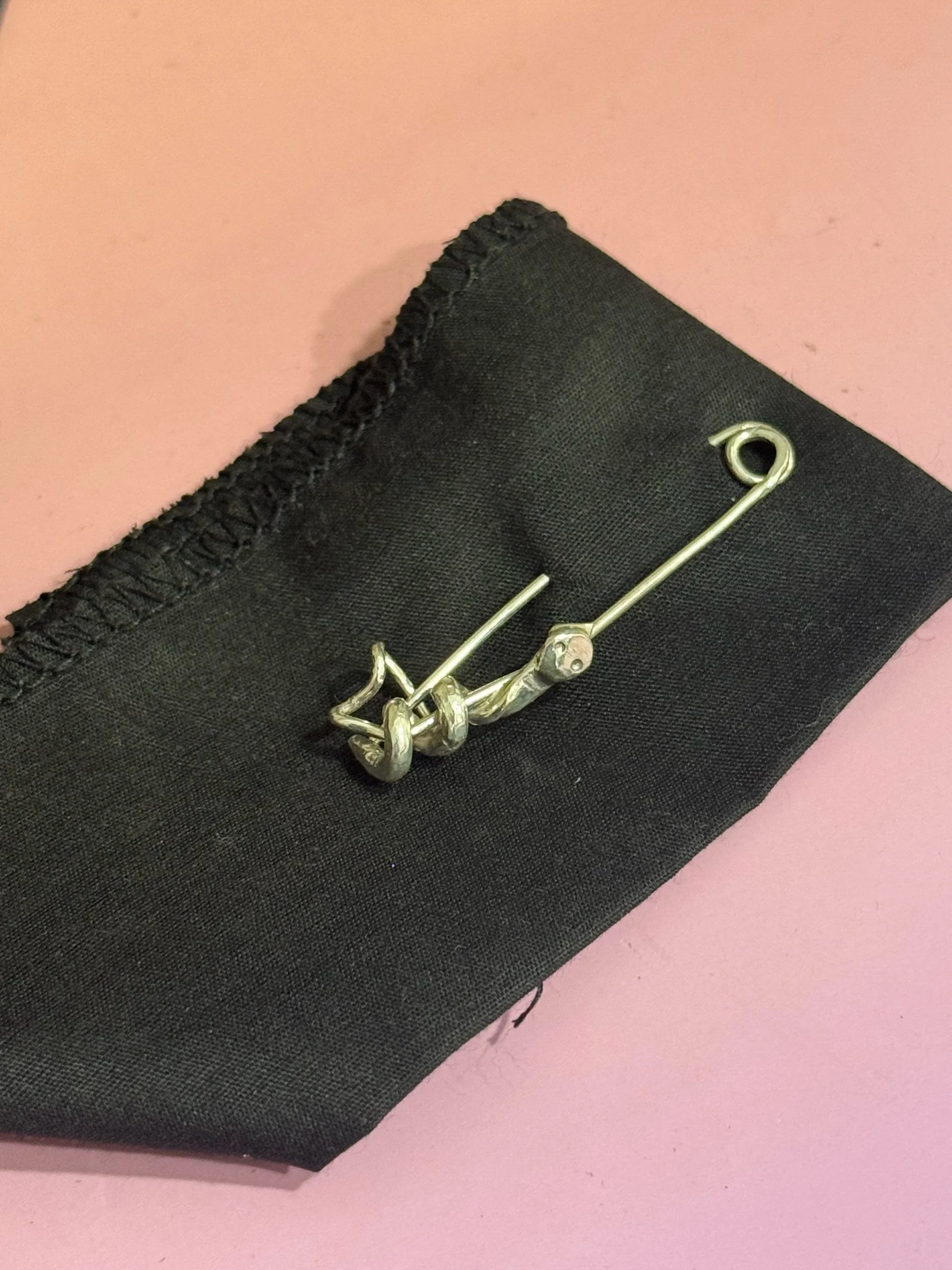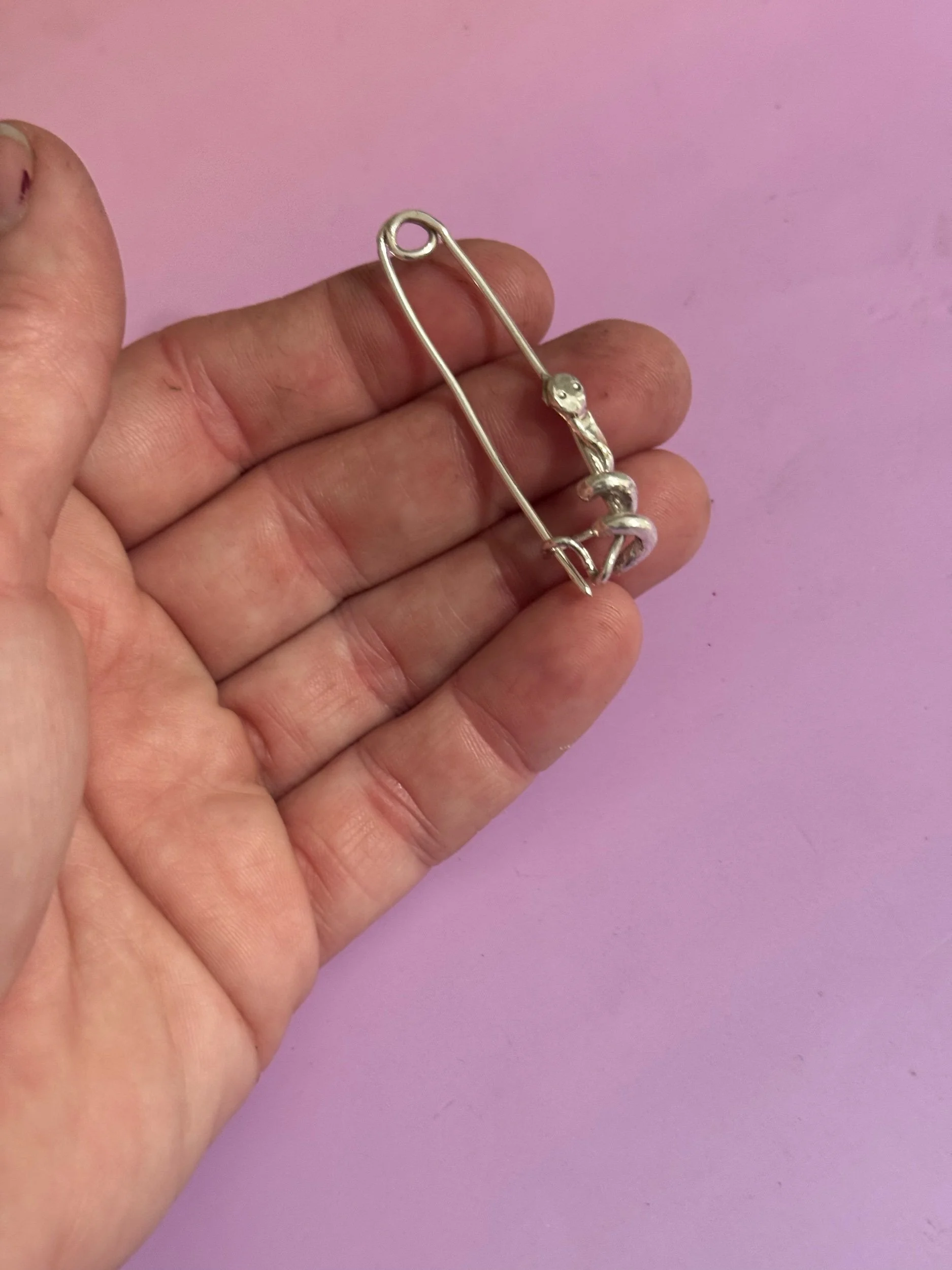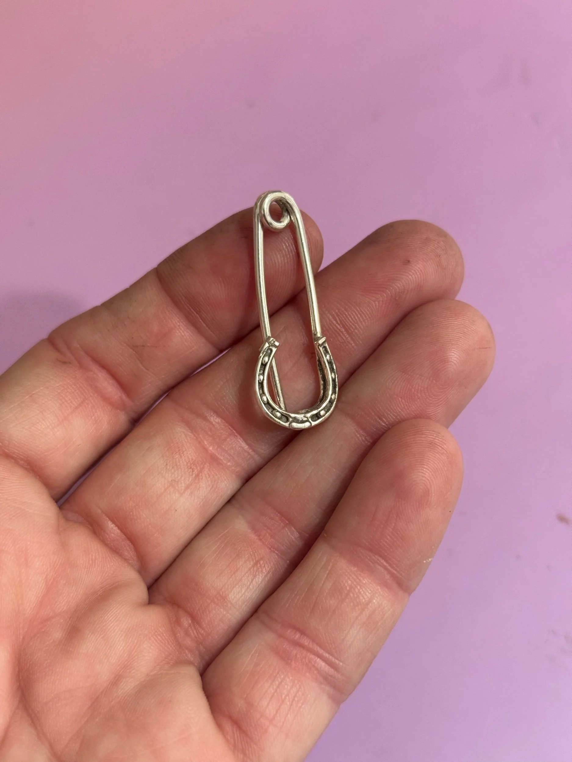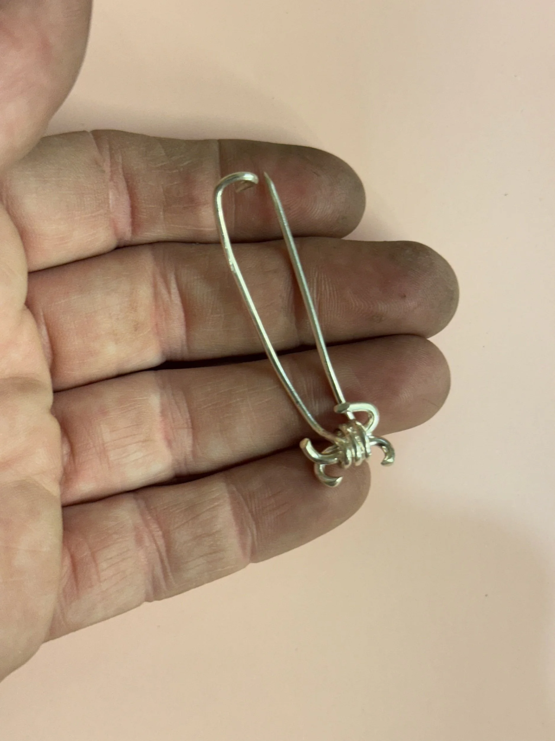 HANDMADE .925 STERLING SILVER SAFETY PIN WITH STERLING SILVER BARBED WIRE. SHARPENED WITH LATCH CLOSURE. MEASURES BETWEEN 1.25” AND 1.5”