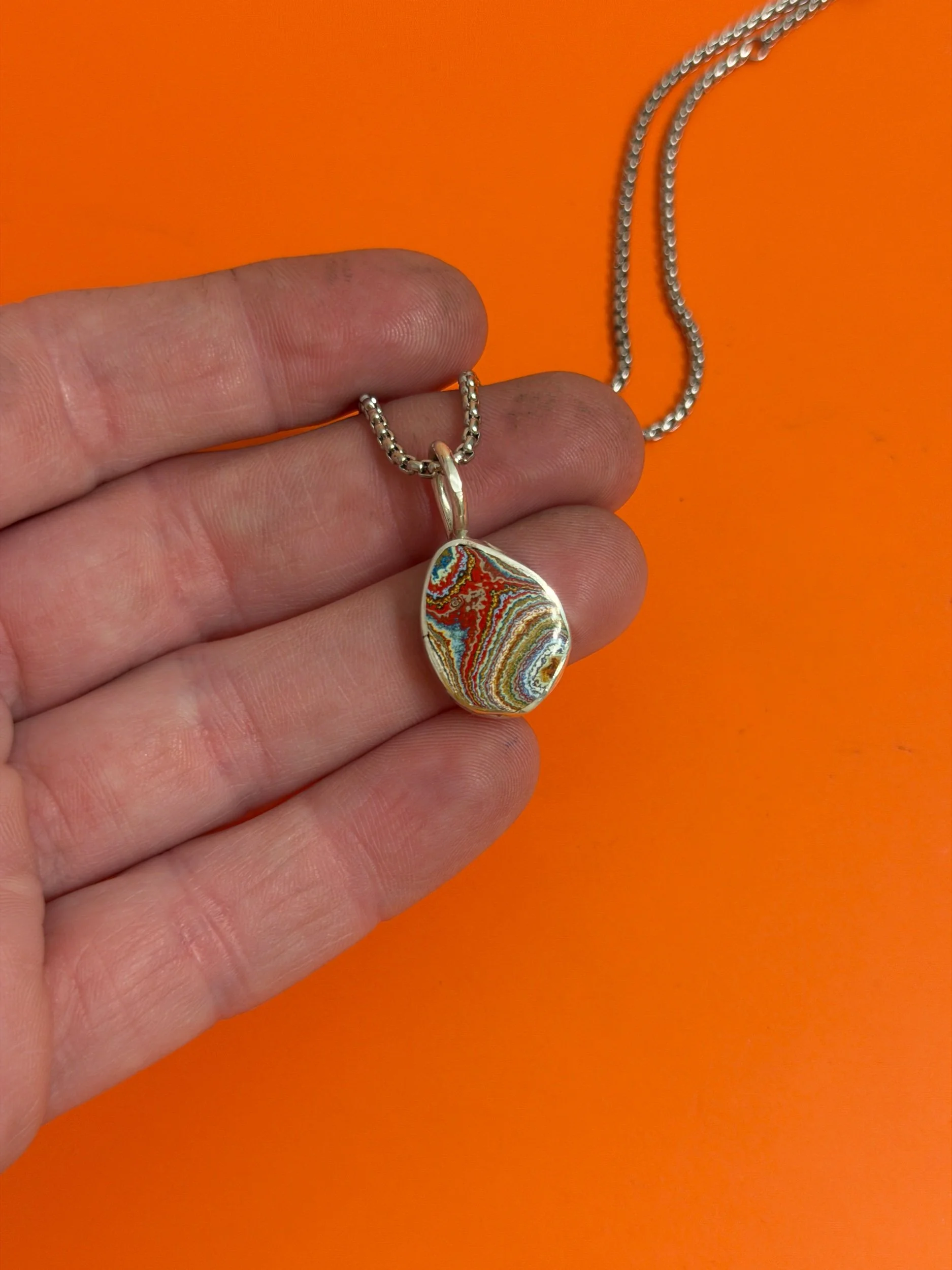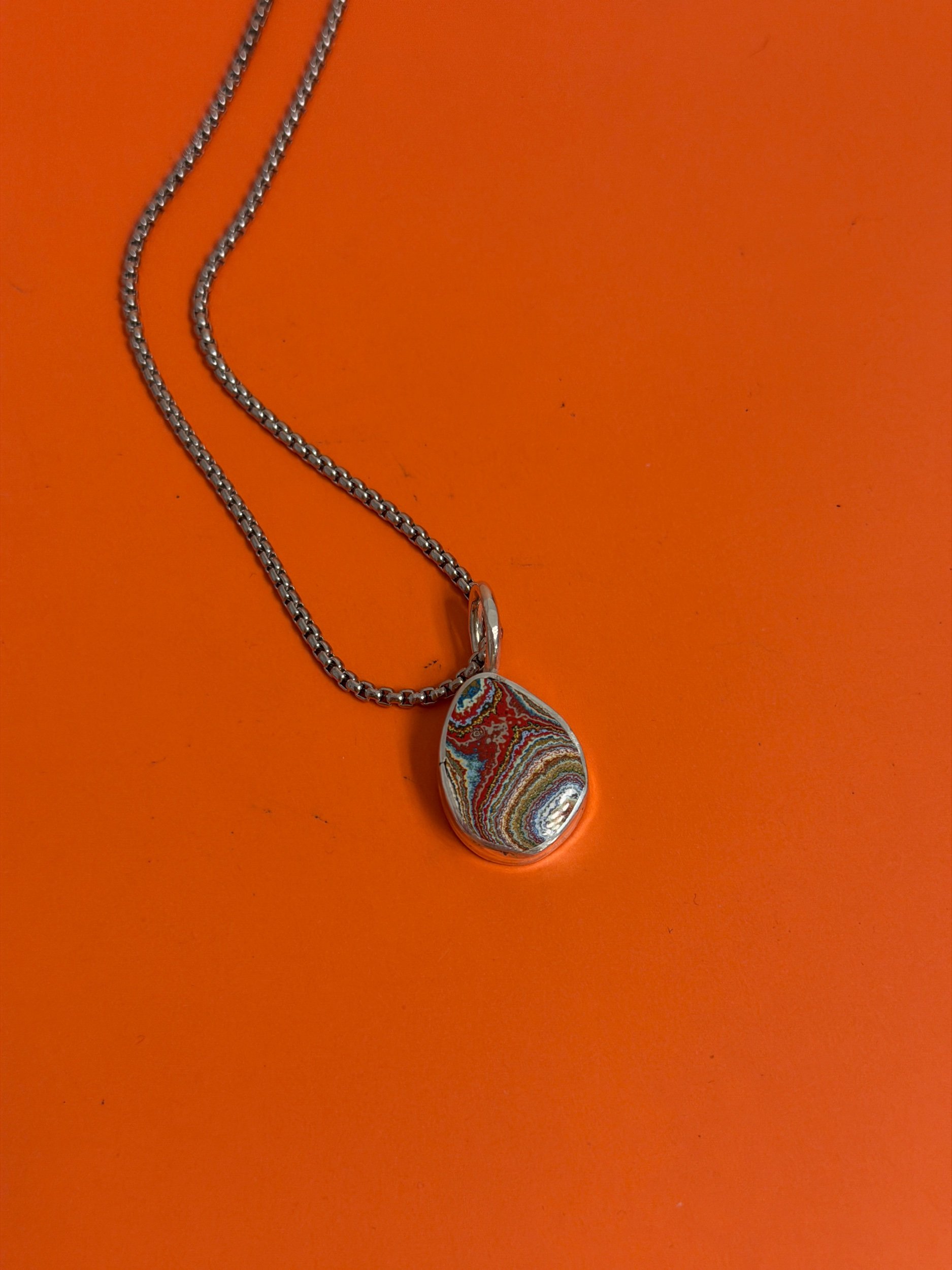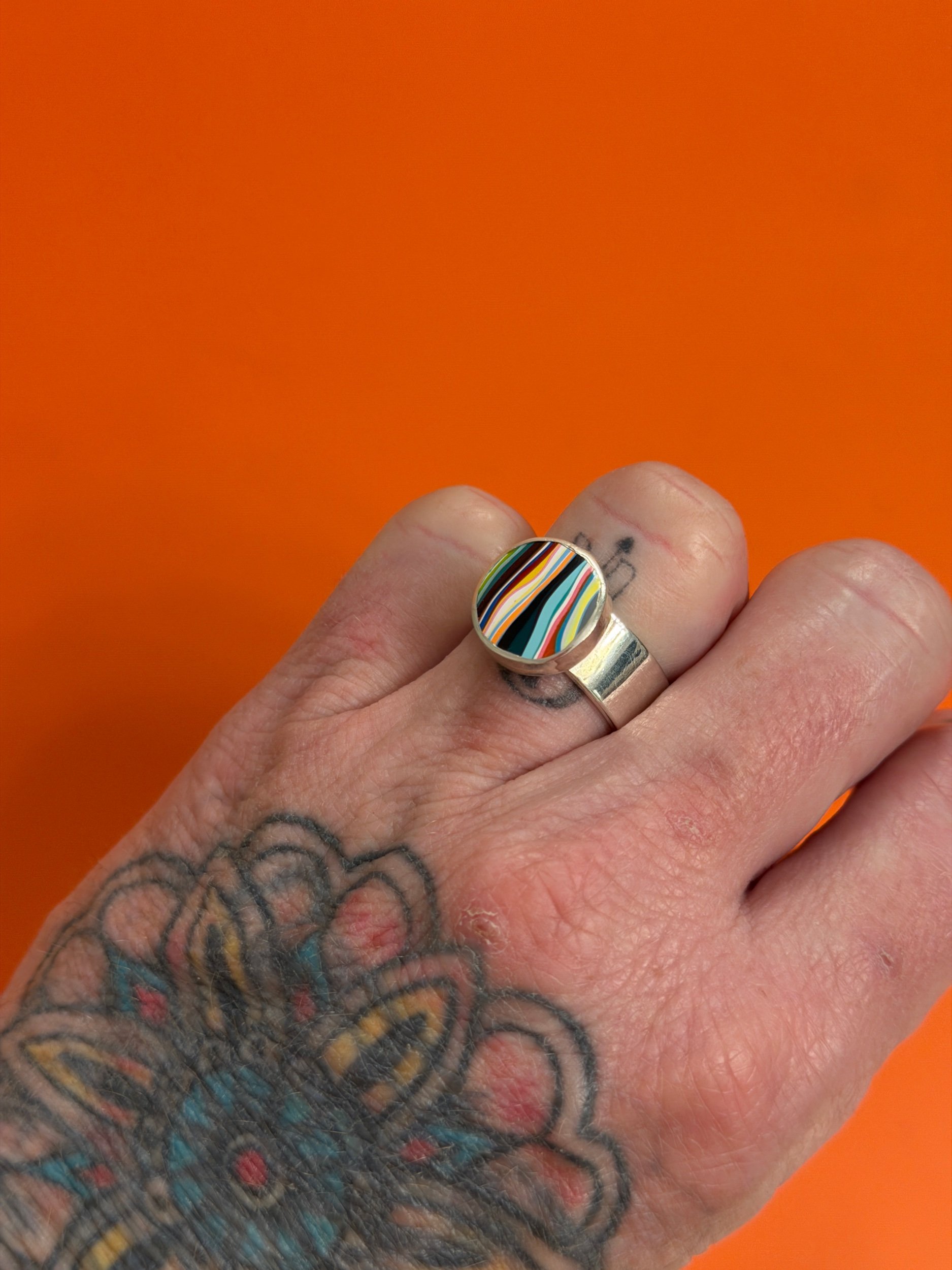 RARE 1970’S DETROIT LYNCH STREET PLANT VINTAGE FORDITE, WITH BRIGHT ORANGES, GREENS, PINKS AND A RAINBOW OF 1970’S COLOR THEMES, CREATING A ONE OF A KIND, UNIQUE PIECE OF WEARABLE ART AND HISTORY, MADE FROM UPCYCLED MATERIALS. MADE COMPLETELY BY HAND FROM SCRATCH, THIS PIECE IS SET IN A .999 FINE SILVER HANDMADE SETTING