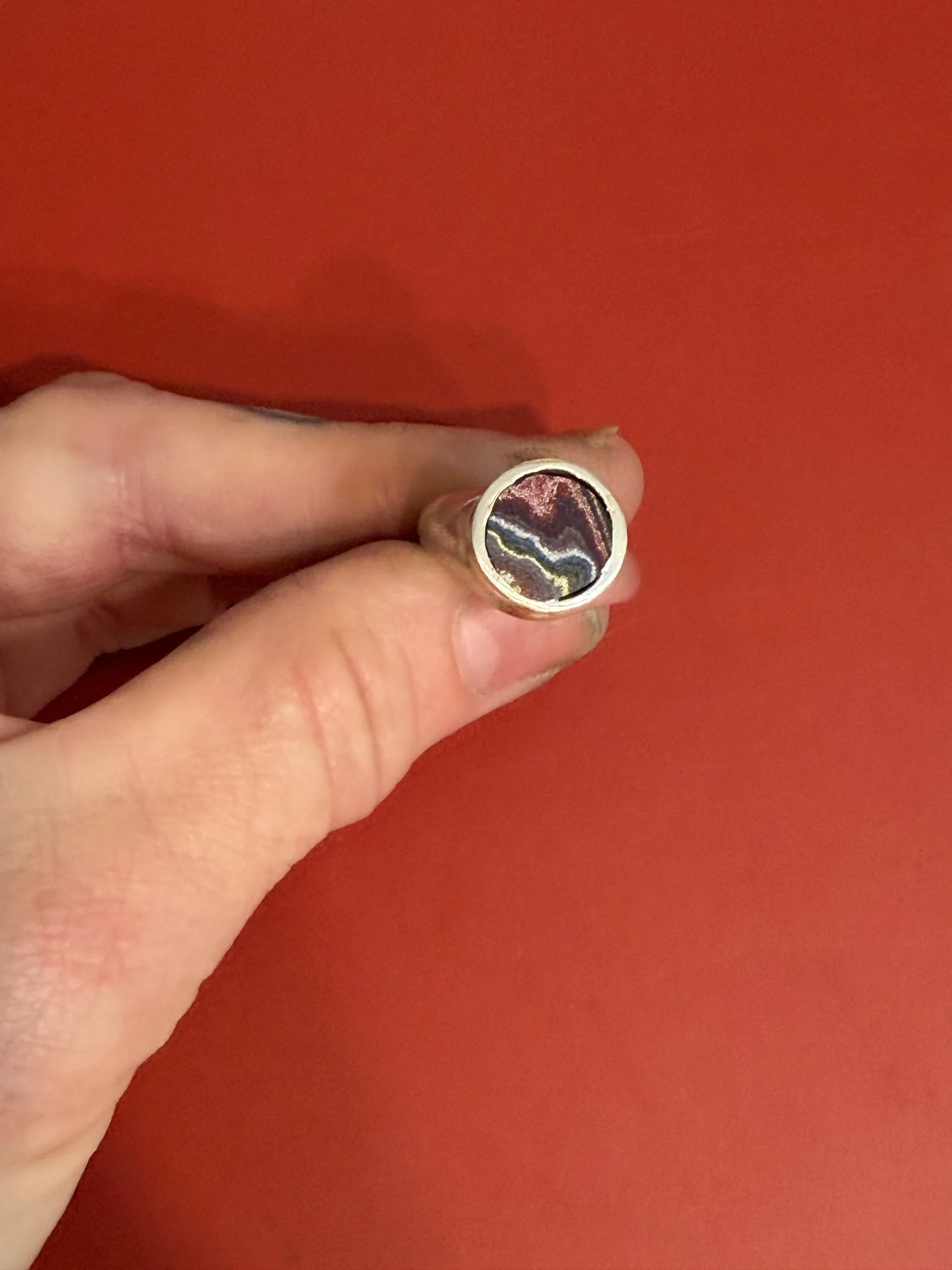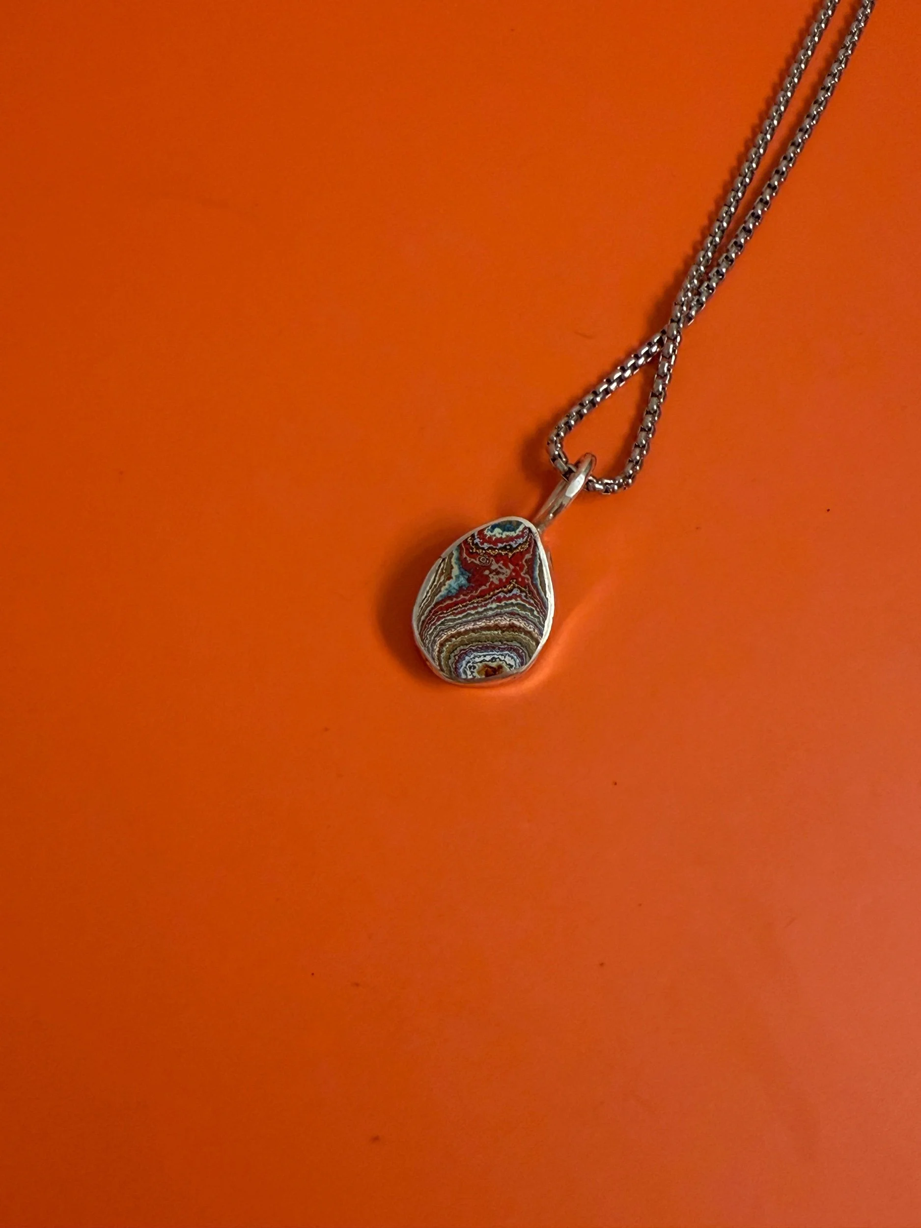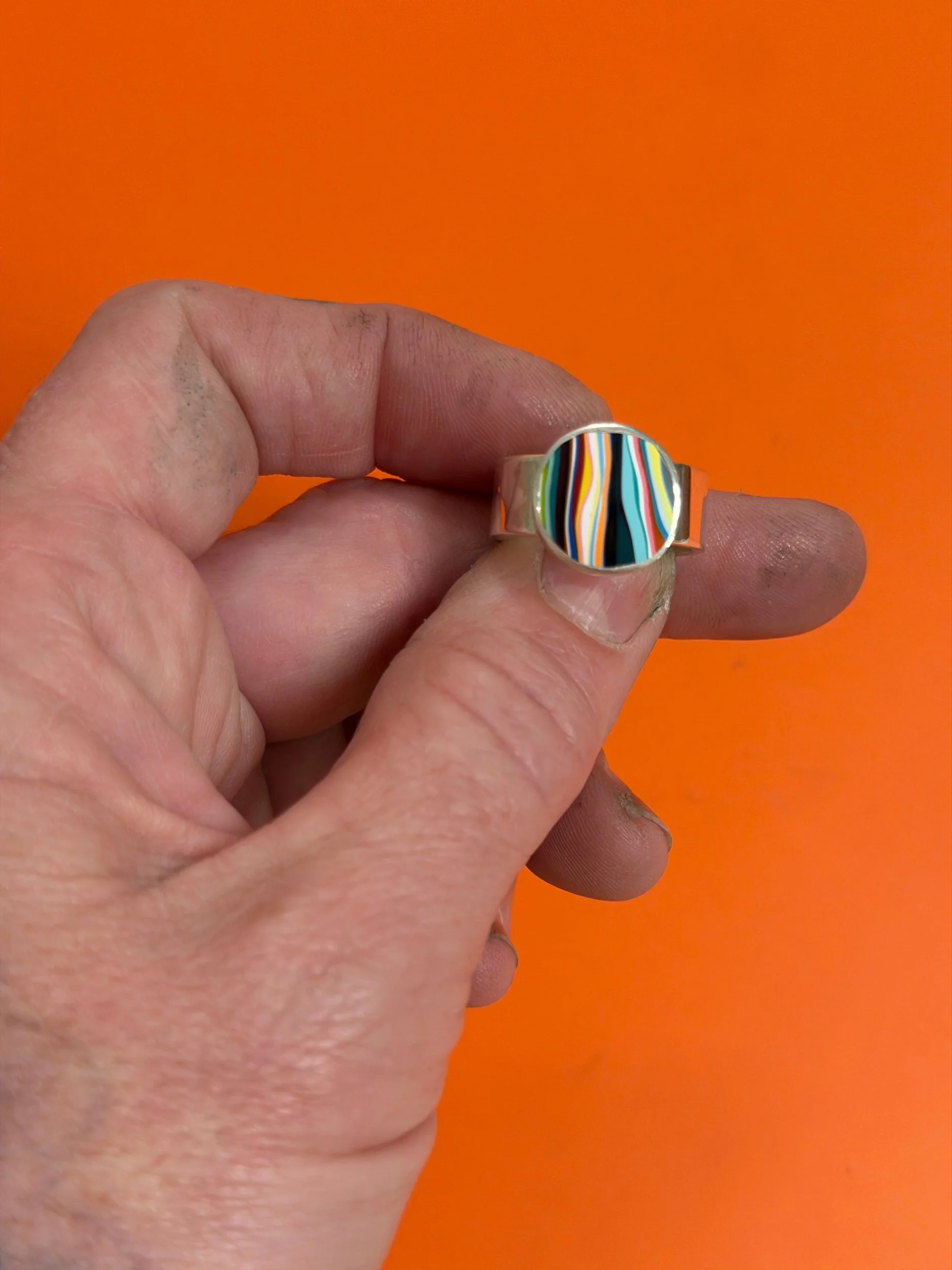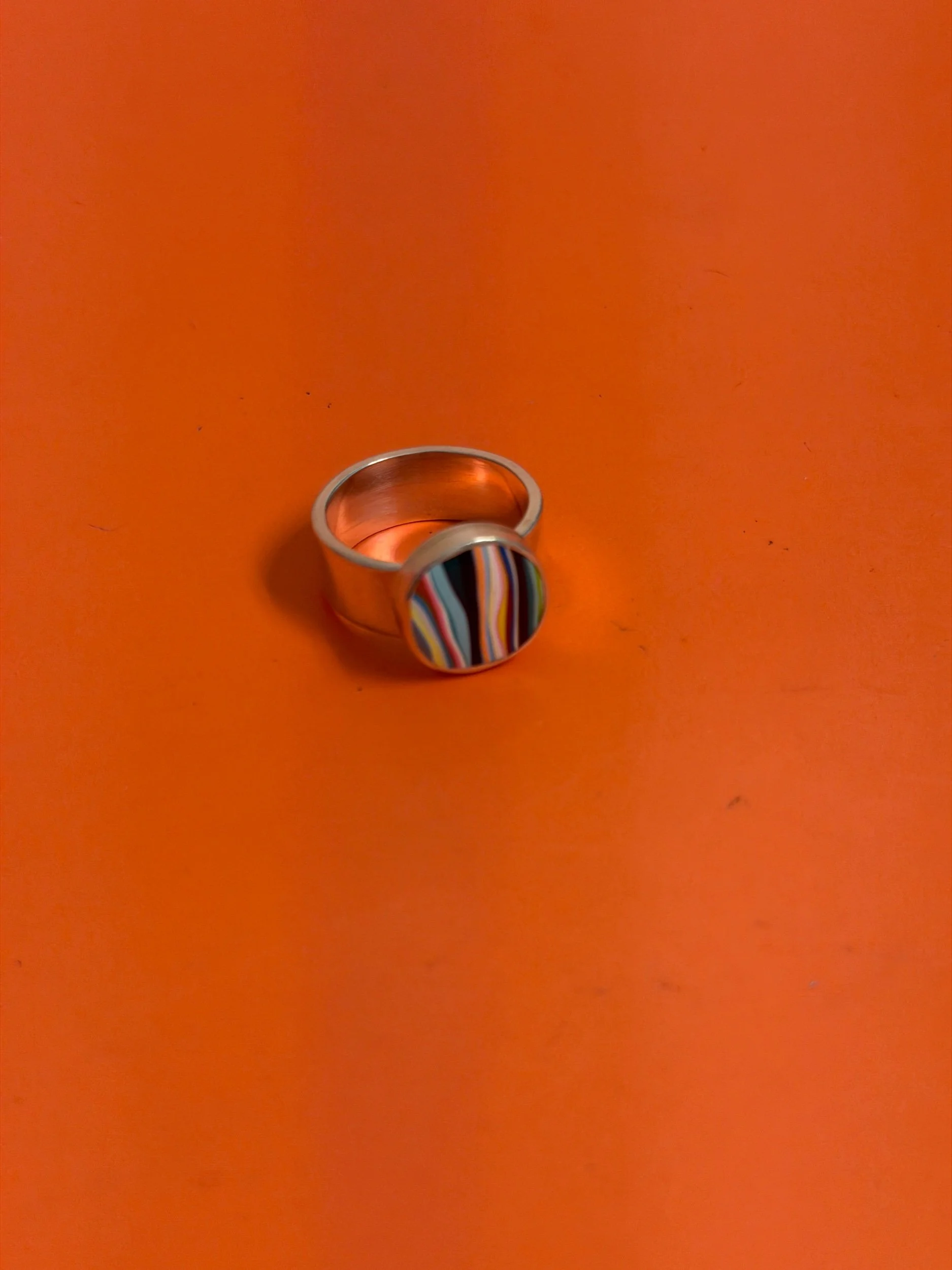 RARE 1970’S DETROIT LYNCH STREET PLANT VINTAGE FORDITE, WITH BRIGHT ORANGES, GREENS, PINKS AND A RAINBOW OF 1970’S COLOR THEMES, CREATING A ONE OF A KIND, UNIQUE PIECE OF WEARABLE ART AND HISTORY, MADE FROM UPCYCLED MATERIALS. MADE COMPLETELY BY HAND FROM SCRATCH, THIS PIECE IS SET IN A .999 FINE SILVER HANDMADE SETTING