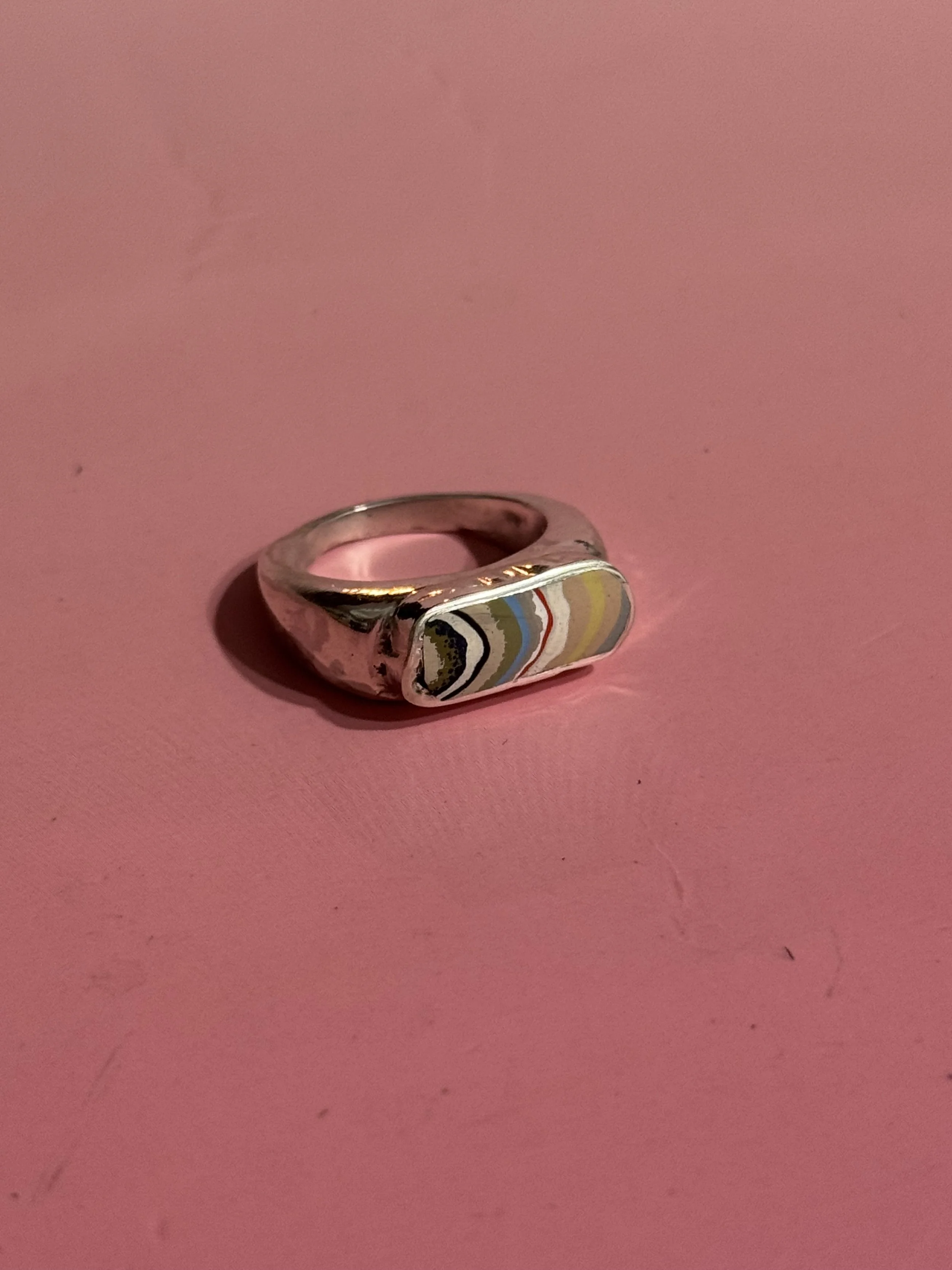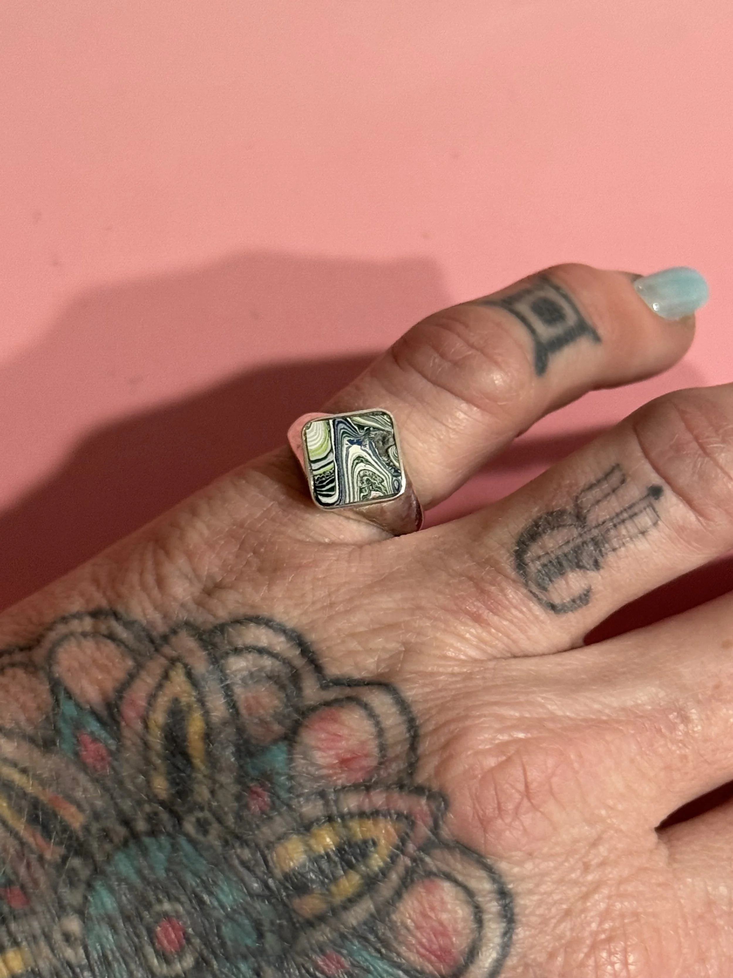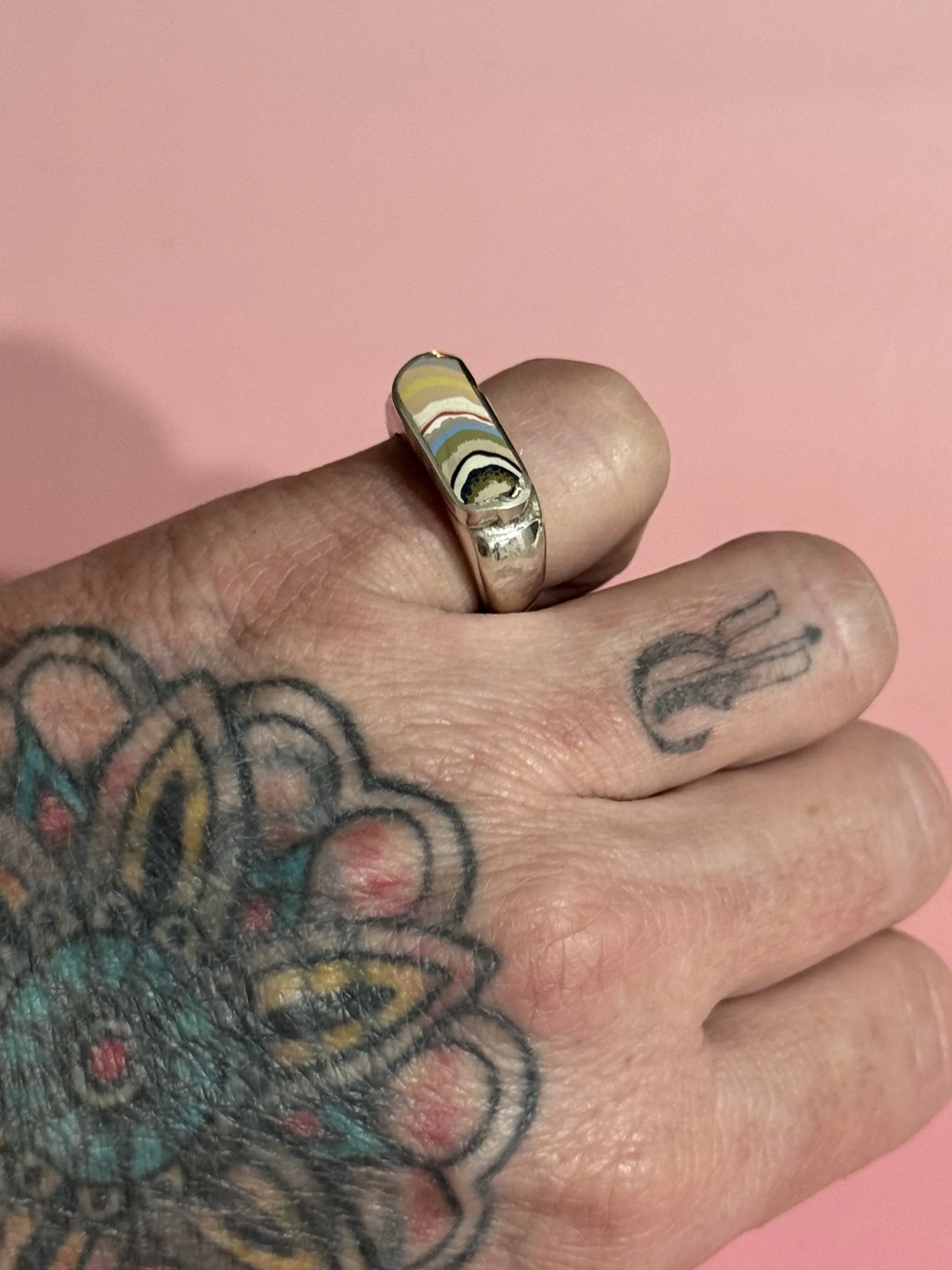 STUNNING CUT OF BOWLING GREEN KENTUCKY FORDITE, SHAPED INTO A PYSCHEDLIC PATTERN OF GLITTERY COLORS. SET IN A SINGLE SHANK STERLING SILVER SIGNET RING SETTING, SIZE 7. POLISHED TO A MIRROR SHINE AND READY TO SHIP. OOAK, MADE BY HAND WITH LOVE.