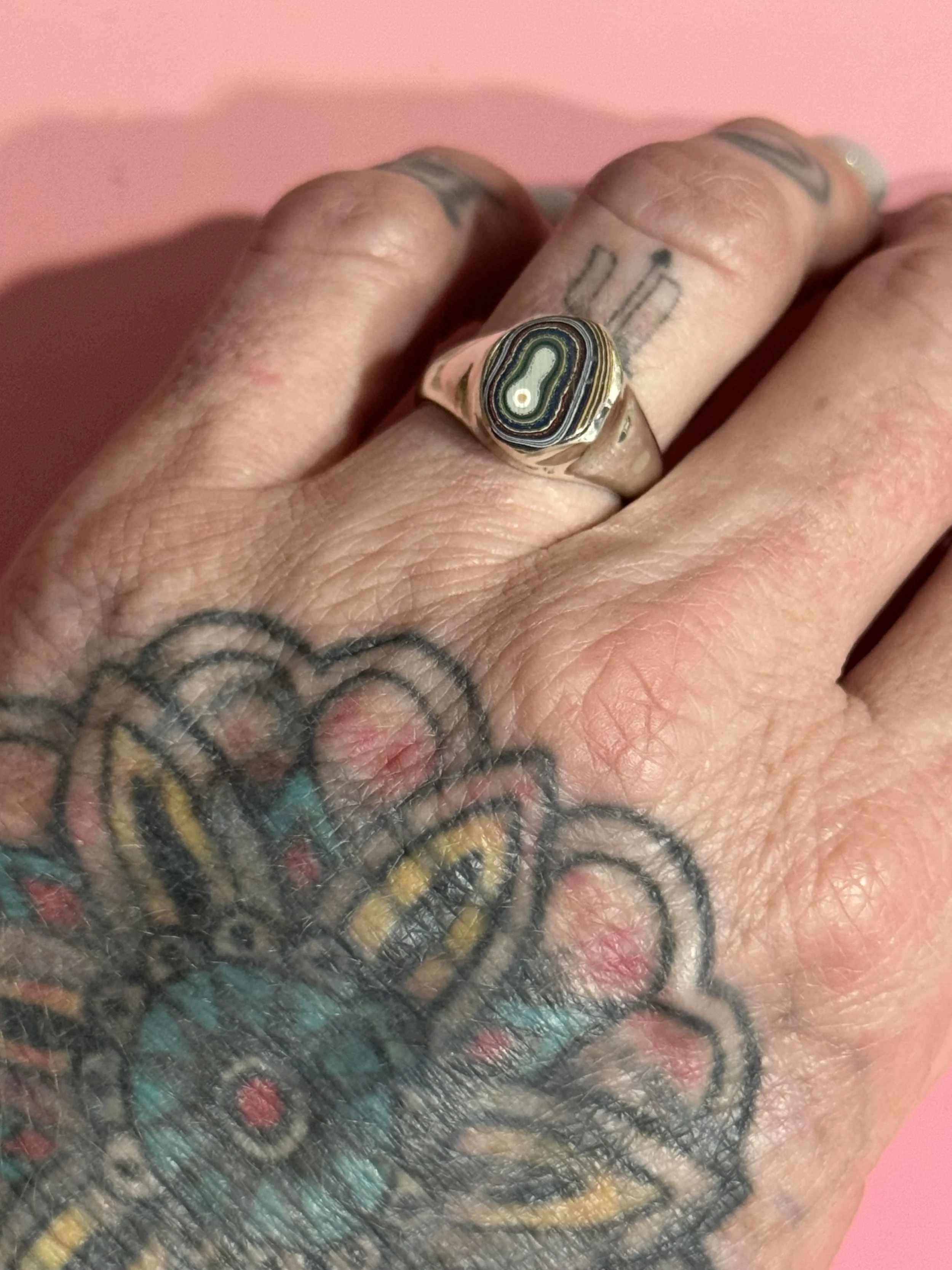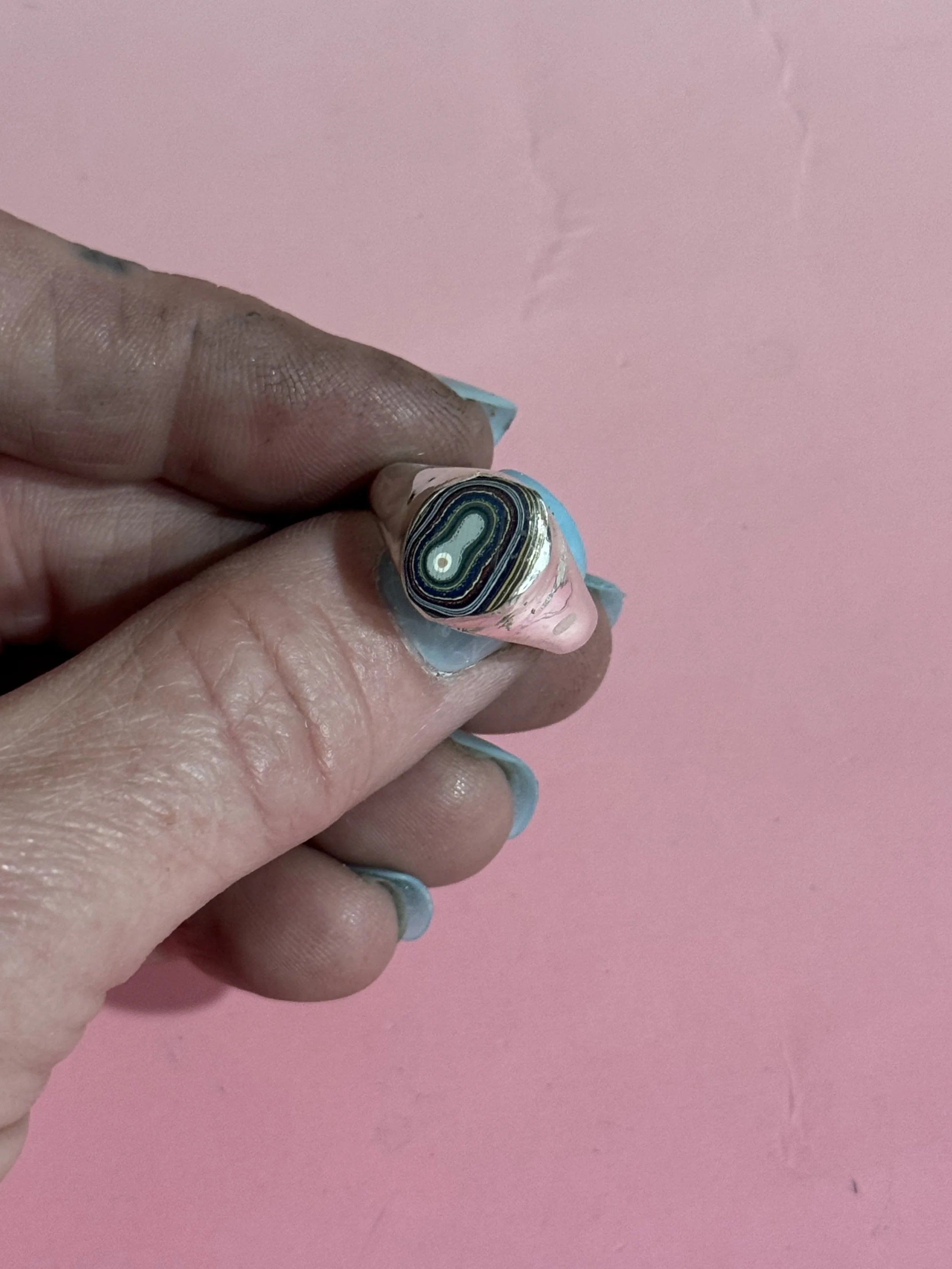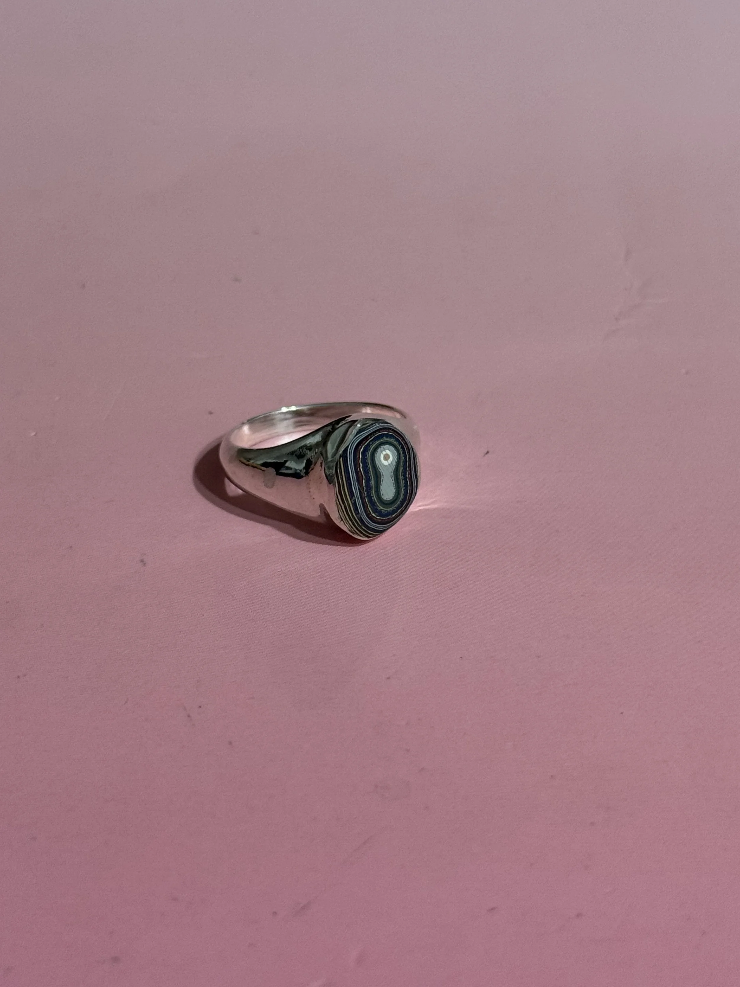 STUNNING CUT OF BOWLING GREEN KENTUCKY FORDITE, SHAPED INTO A PYSCHEDLIC PATTERN OF GLITTERY COLORS. SET IN A SINGLE SHANK STERLING SILVER SIGNET RING SETTING, SIZE 7. POLISHED TO A MIRROR SHINE AND READY TO SHIP. OOAK, MADE BY HAND WITH LOVE.