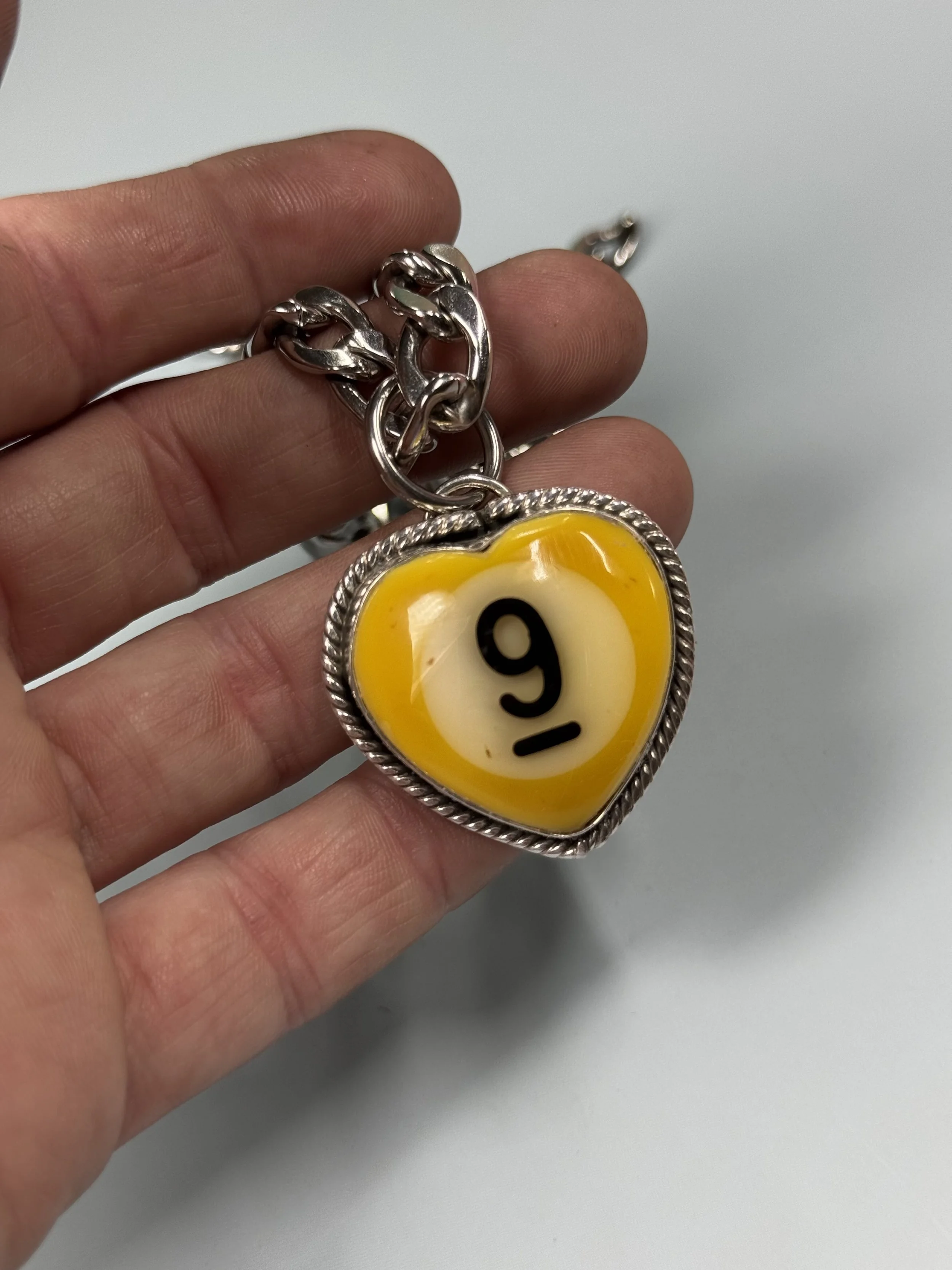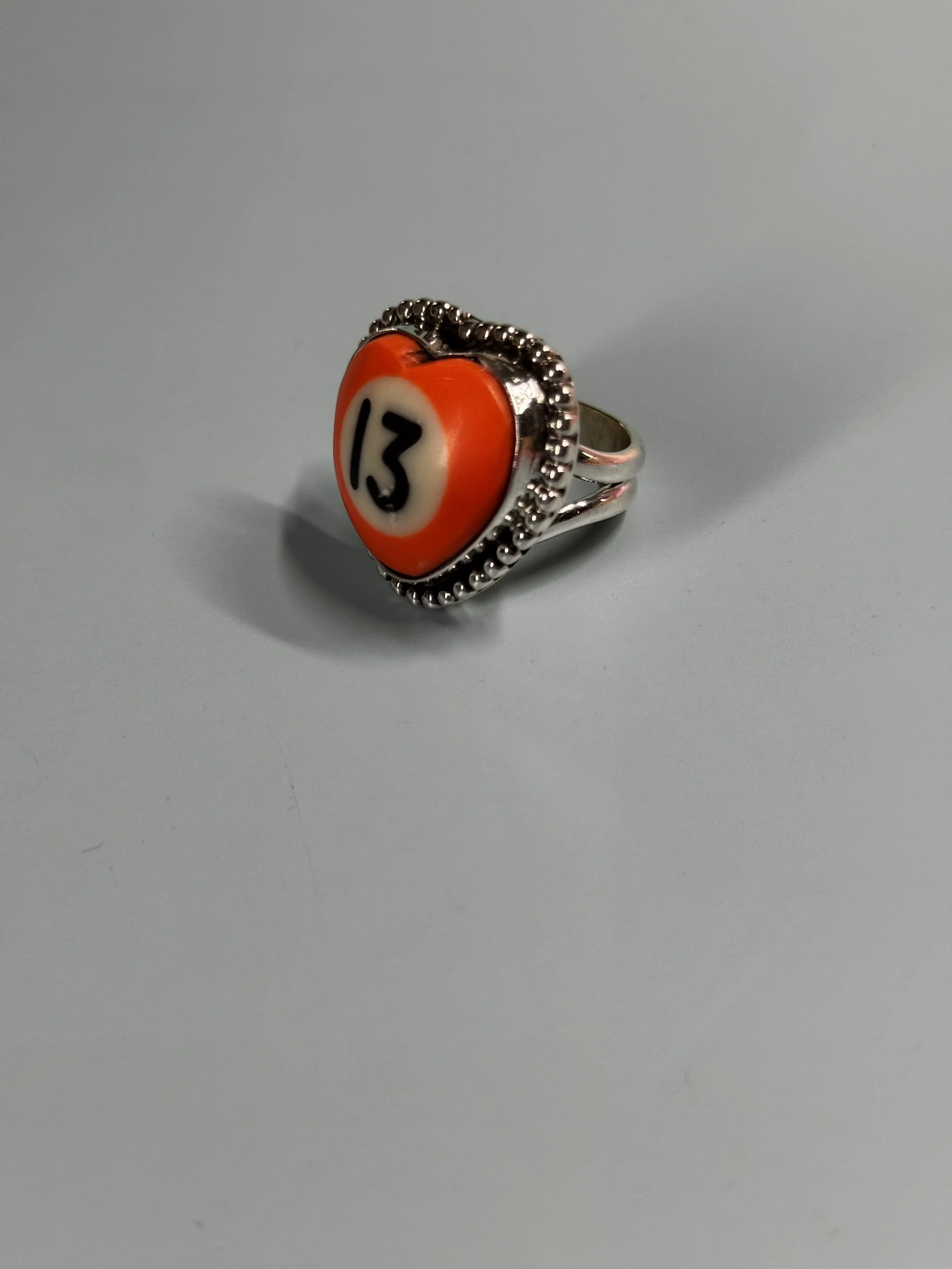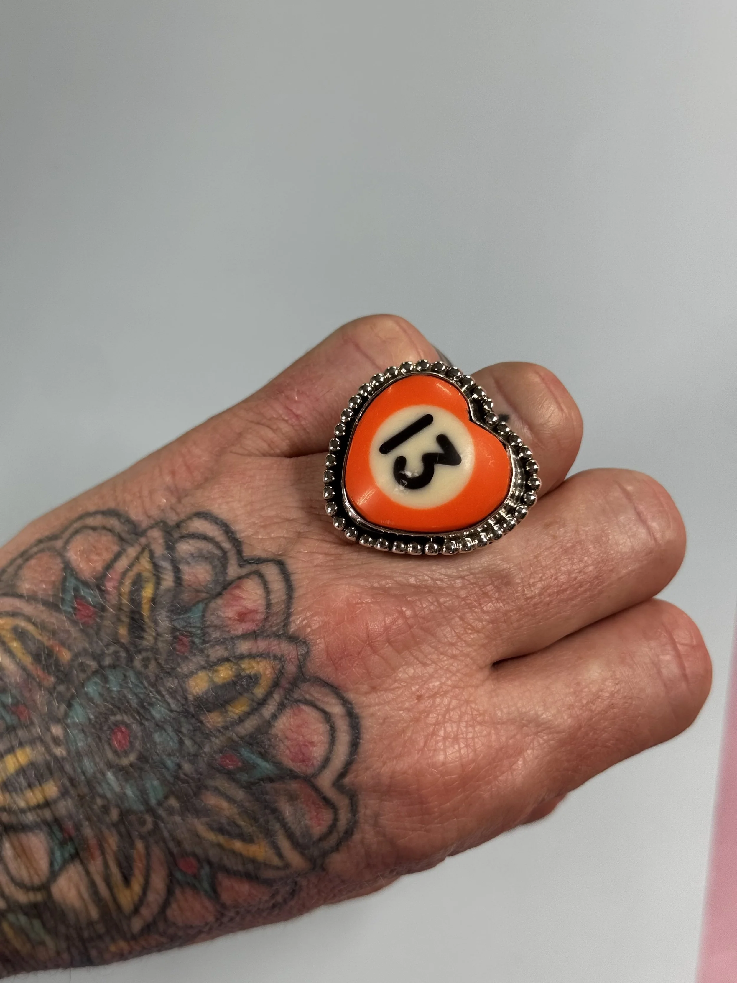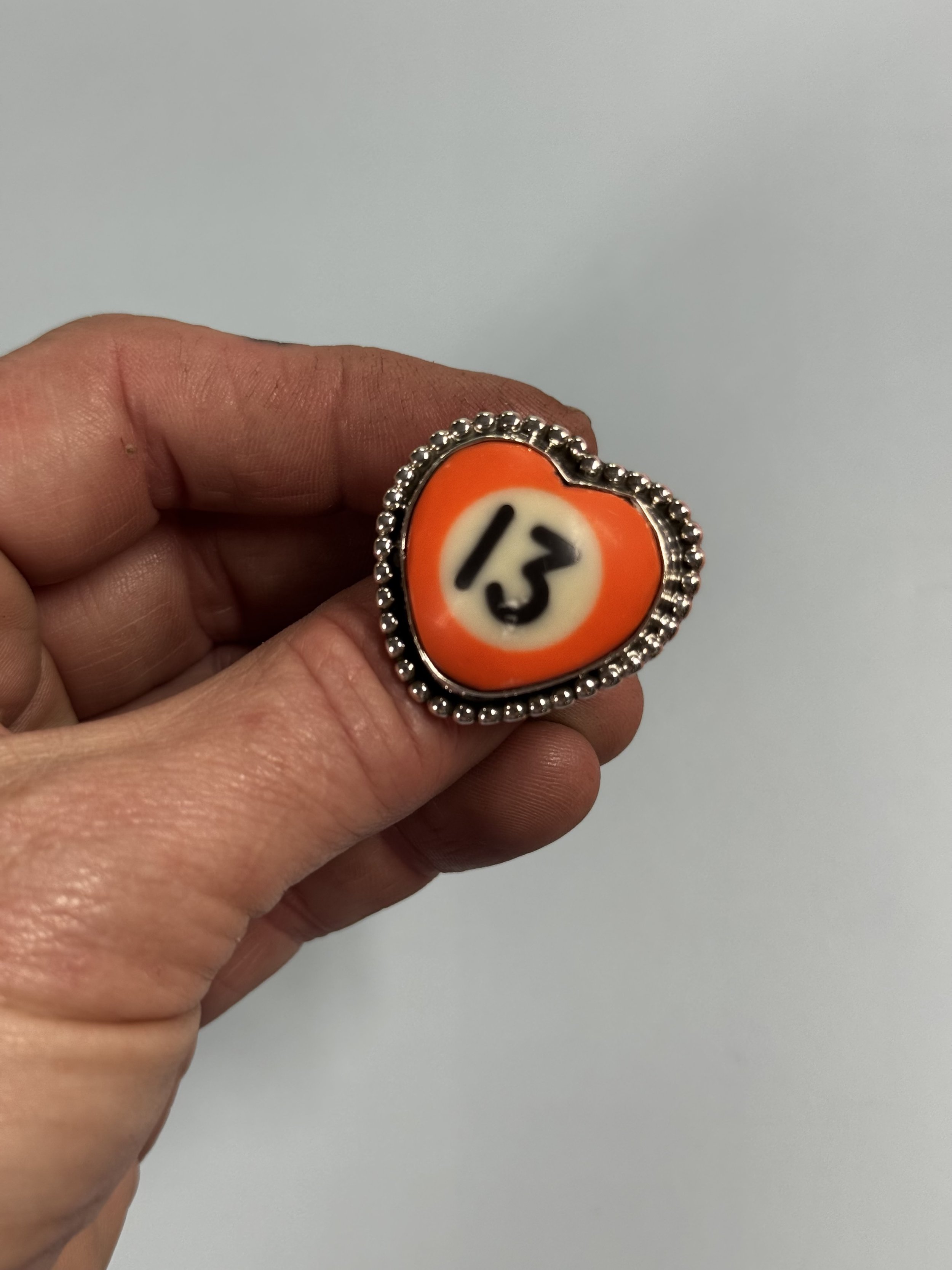 Handcrafted using .925 sterling silver with a signet-style handmade sterling silver band. Hand cut from a vintage maroon 7 ball and shaped into a rounded square, making it a standout piece for anyone who loves to mix timeless style with playful edge. Ring face measures about 1” x 1'“.