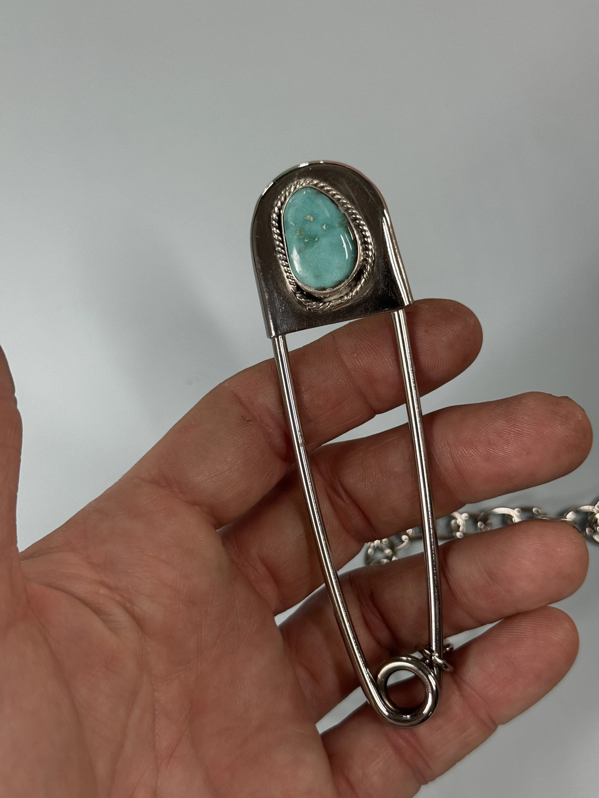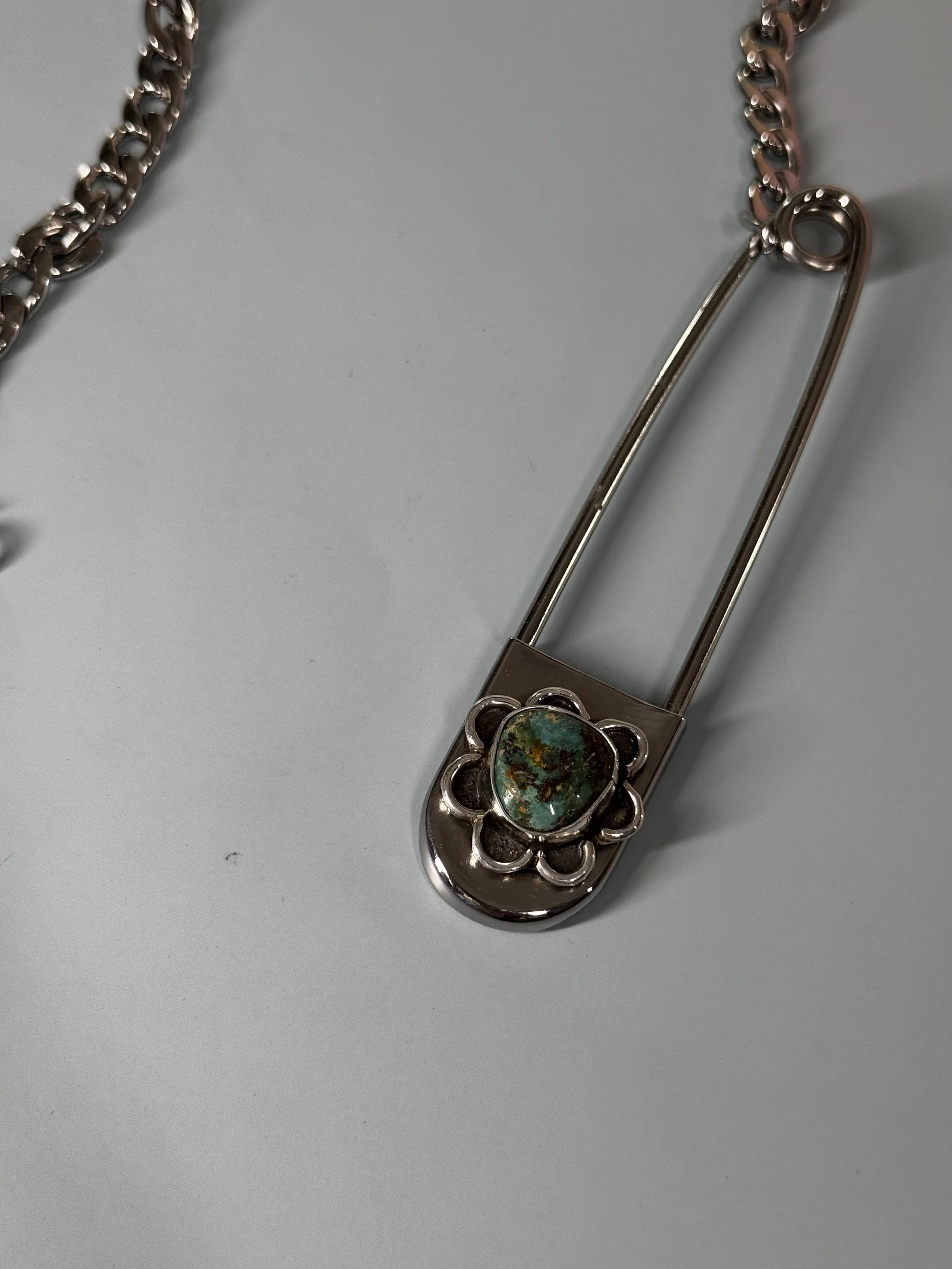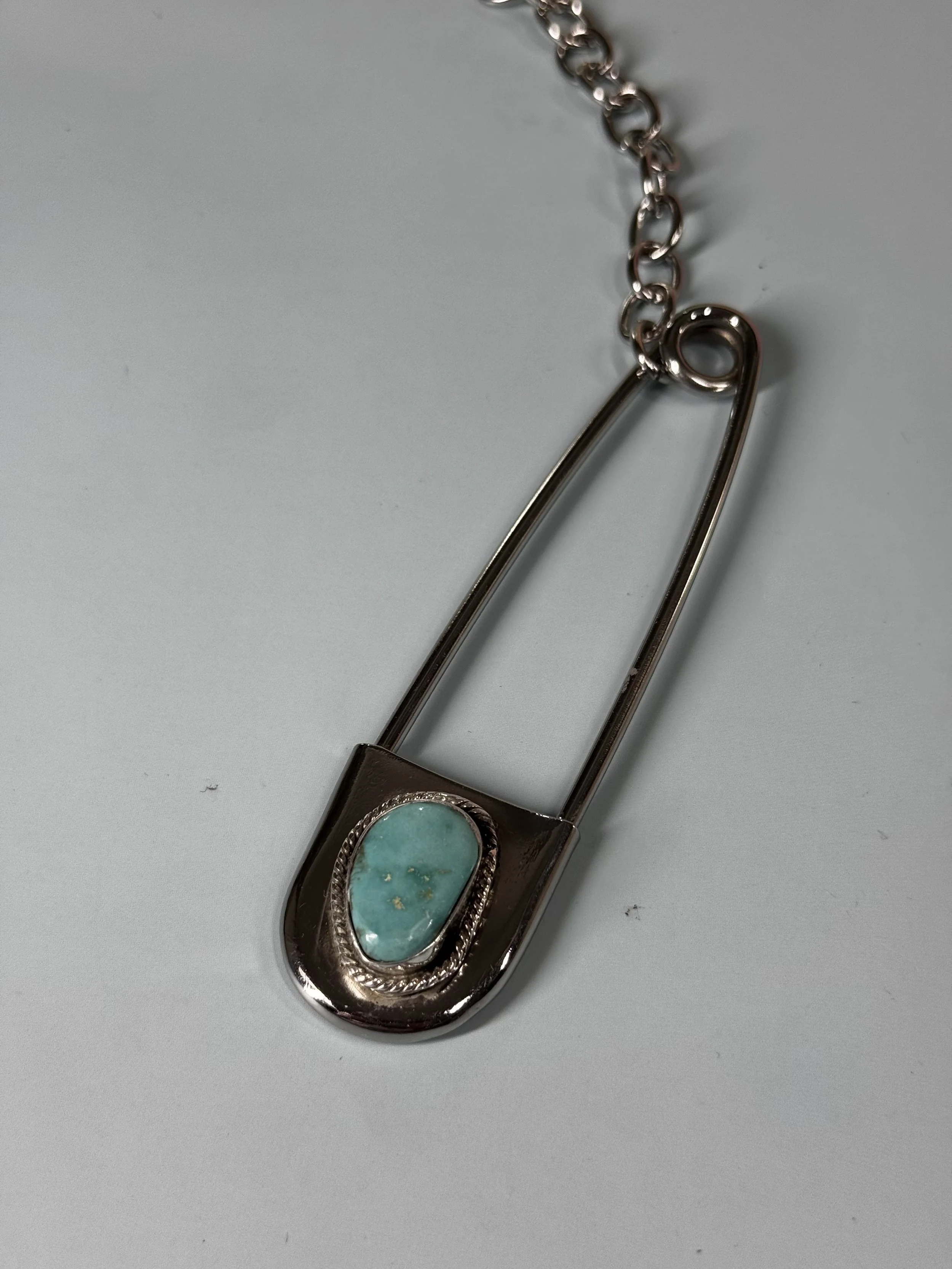 A 4.25-inch stainless steel jumbo safety pin featuring green Manhattan turquoise set in handmade sterling silver setting. Perfect for keychains, belt loops, bag charms, or layering with other accessories. Each piece is handcrafted, so slight variations and unique details may occur, making every pin truly one of a kind. Includes an optional stainless steel wallet chain, please enter length below.