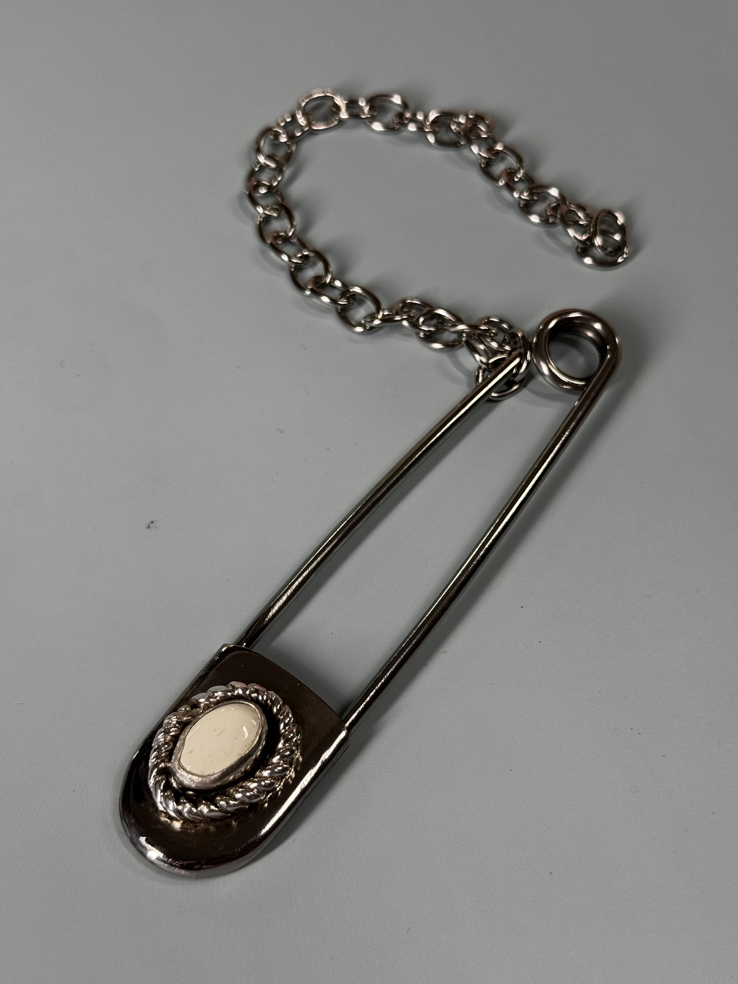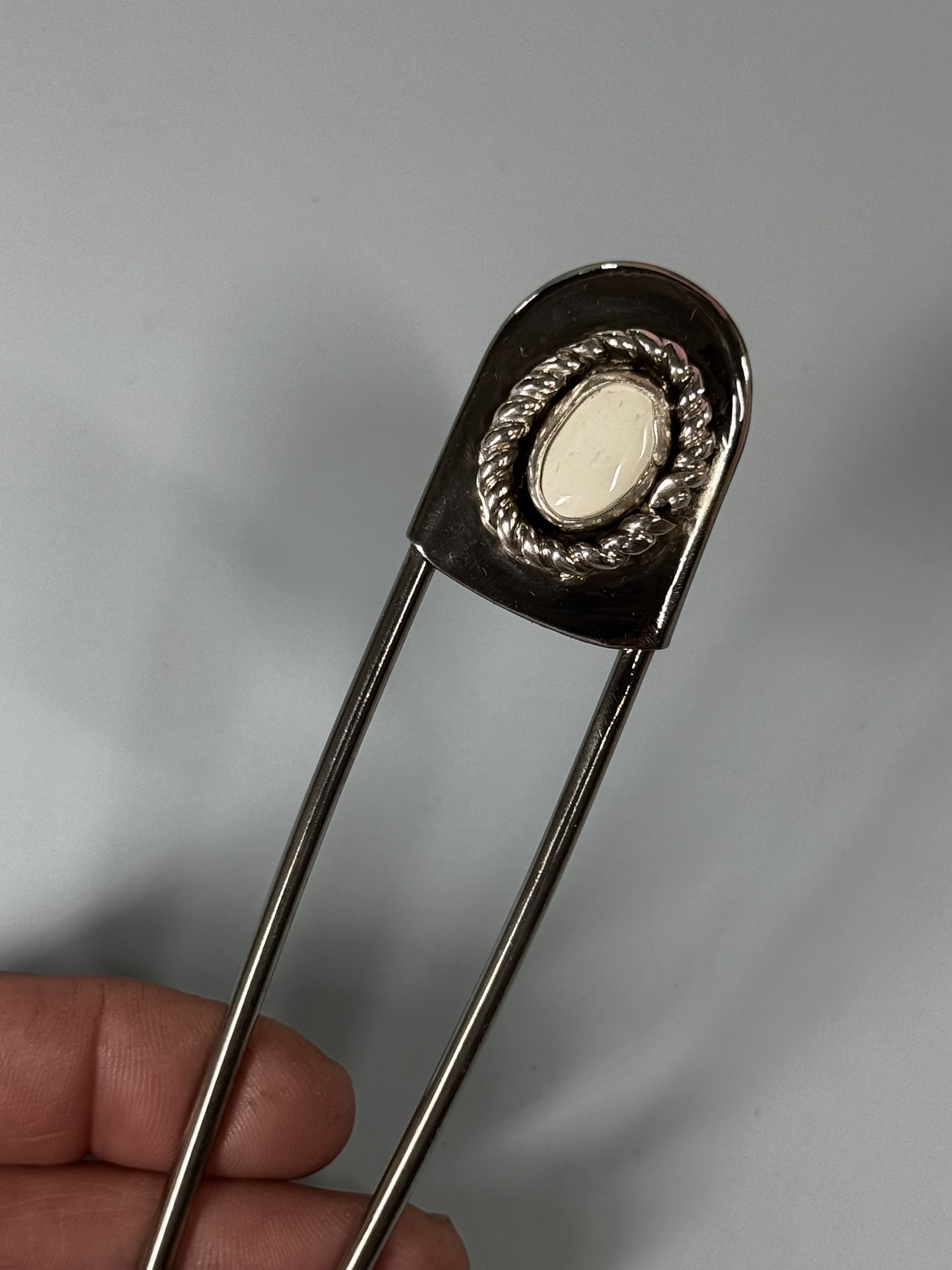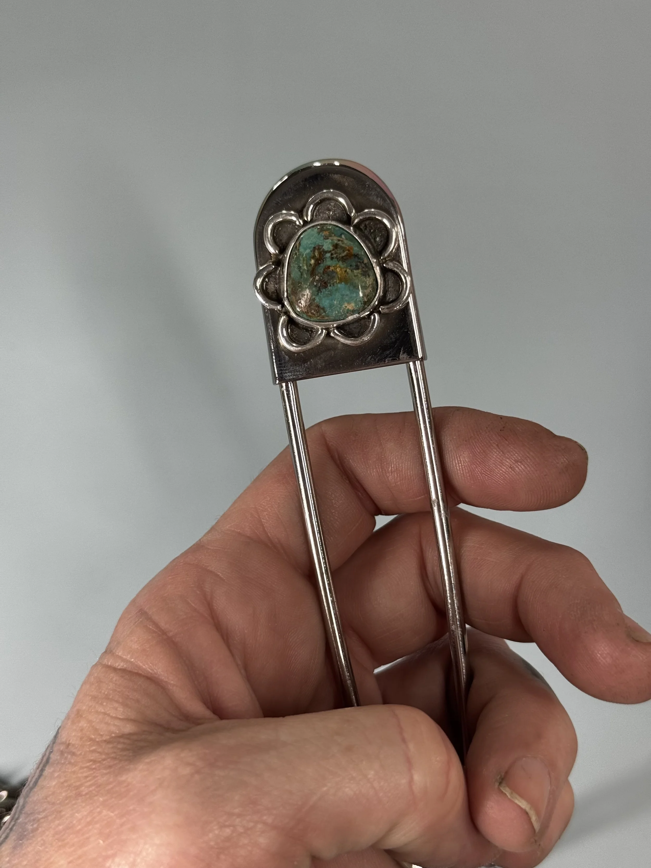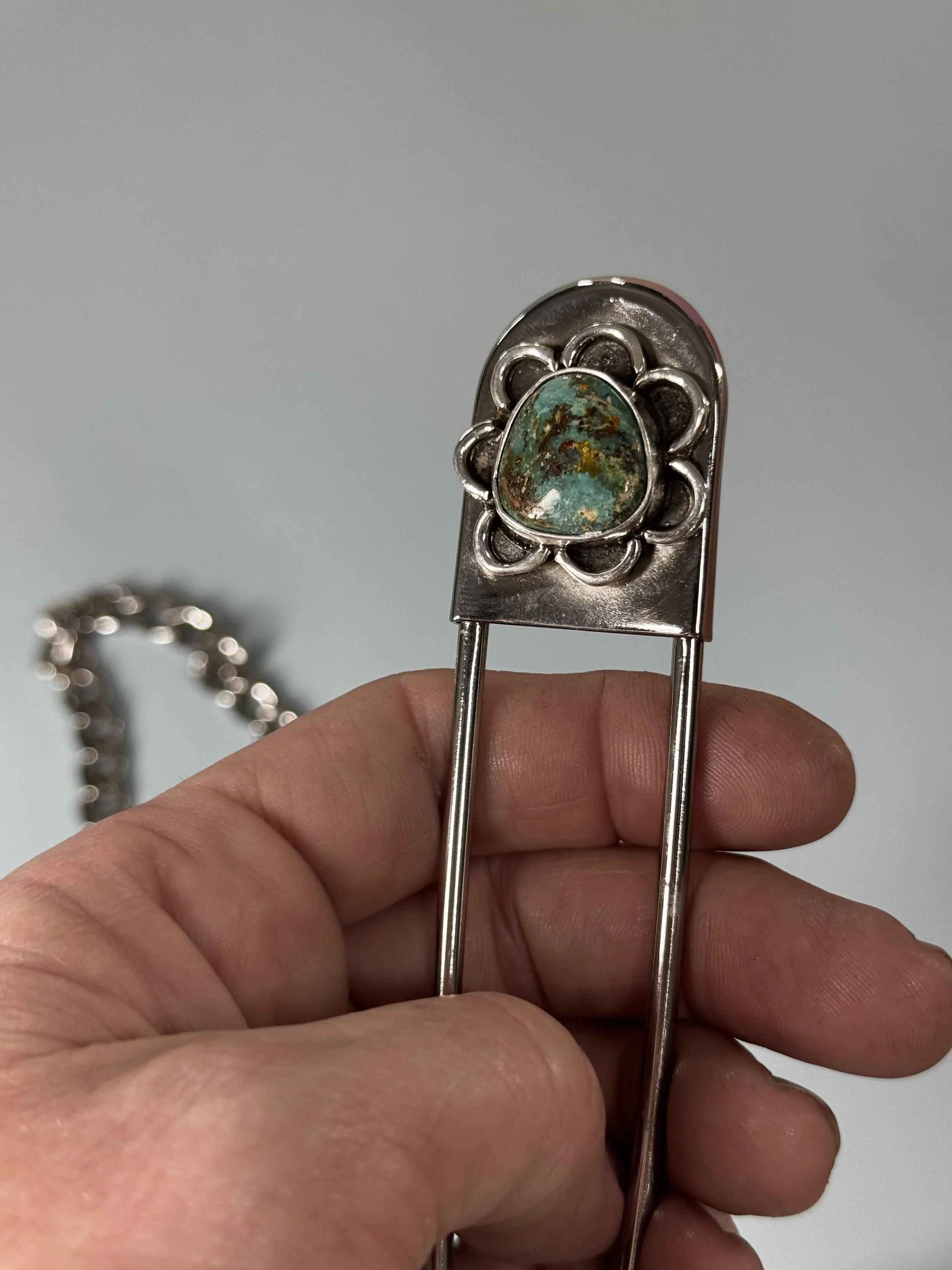 A 4.25-inch stainless steel jumbo safety pin featuring green Manhattan turquoise set in handmade sterling silver setting. Perfect for keychains, belt loops, bag charms, or layering with other accessories. Each piece is handcrafted, so slight variations and unique details may occur, making every pin truly one of a kind. Includes an optional stainless steel wallet chain, please enter length below.